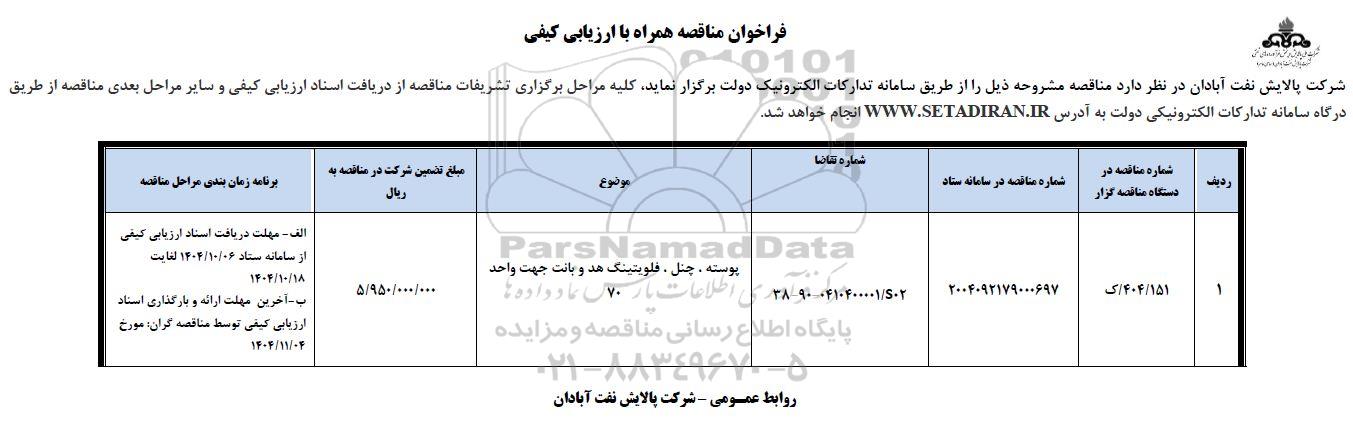 علاقه‌مندان می‌توانند جهت دریافت اسناد و اطلاعات تکمیلی، فراخوان مناقصه پوسته،چنل، فلویتینگ هد و بانت با سامانه مناقصات و مزایدات ایران پارس‌نماد داده ها 88349670 تماس حاصل نمایند.