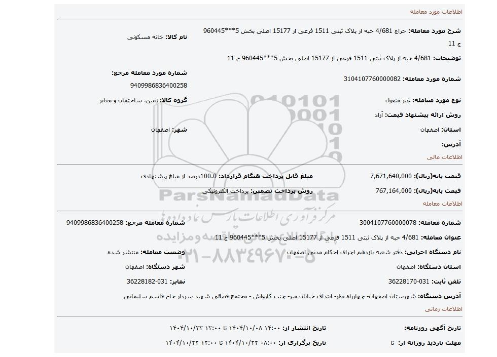 | شرح مورد معامله: حراج 4/681 حبه از پلاک ثبتی 1511 فرعی از 15177 اصلی بخش 5***960445 ج 11 | نام کالا: خانه مسکونی | |