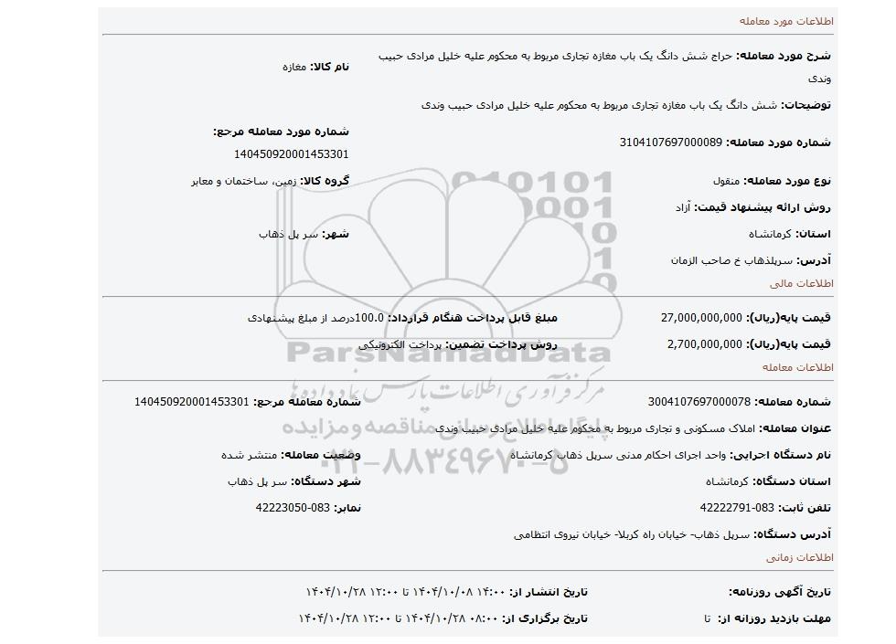 شرح مورد معامله: حراج شش دانگ یک باب مغازه تجاری مربوط به محکوم علیه خلیل مرادی حبیب وندینام کالا: مغازه