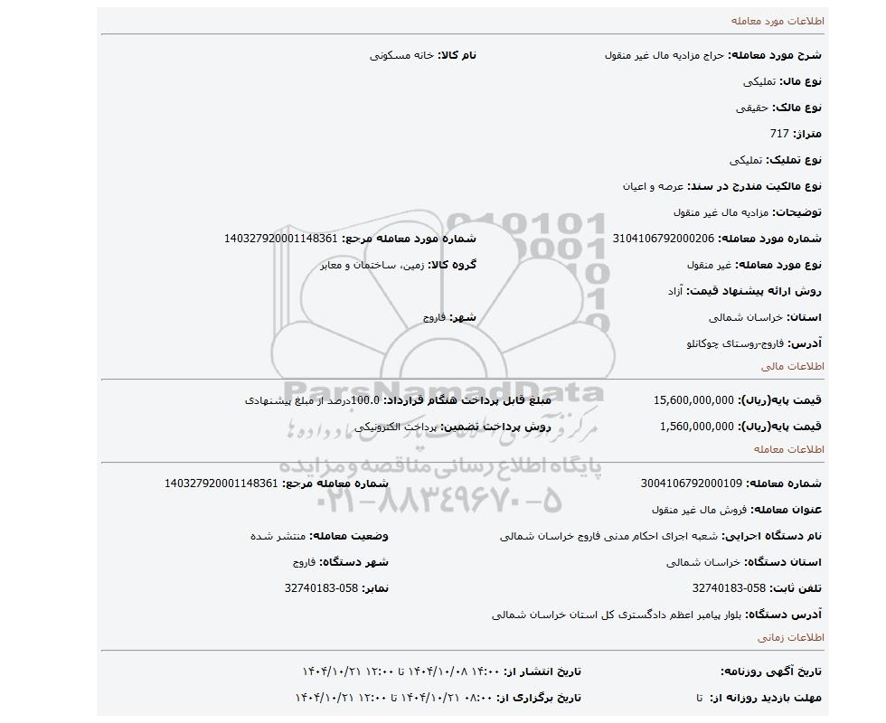 مزایده عمومی مزایده مزادیه مال غیر منقول برگزار میگردد. از کلیه افراد متخصص و شرکت‌های واجد شرایط دعوت به عمل می‌آید تا در این مزایده با کد خبرگزاری پارس نماد : 10071069 شرکت نمایند تاریخ شروع مزایده : 1404/10/08 مهلت شرکت در مزایده: تا پایان روز 1404/10/21 مکان برگزاری اموال واگذاری استان‌های مزایدات استان خراسان شمالی و دسته‌بندی‌های مربوط به این حراجی املاک و زمین میباشد.