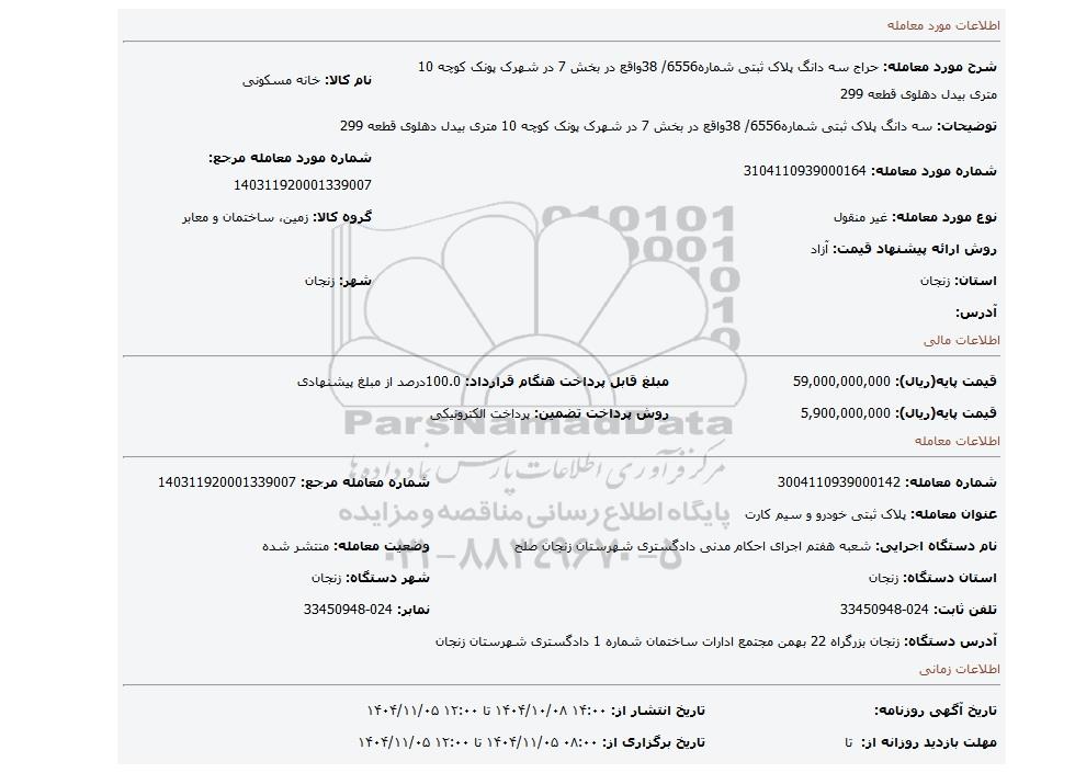 نام دستگاه اجرایی: شعبه هفتم اجرای احکام مدنی دادگستری شهرستان زنجان صلحوضعیت معامله: منتشر شده