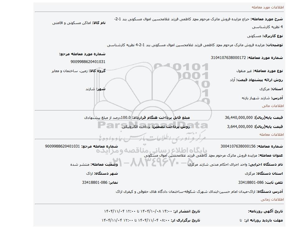 | عنوان معامله: مزایده فروش ماترک مرحوم محمد کاظمی فرزند غلامحسین اموال مسکونی | ||