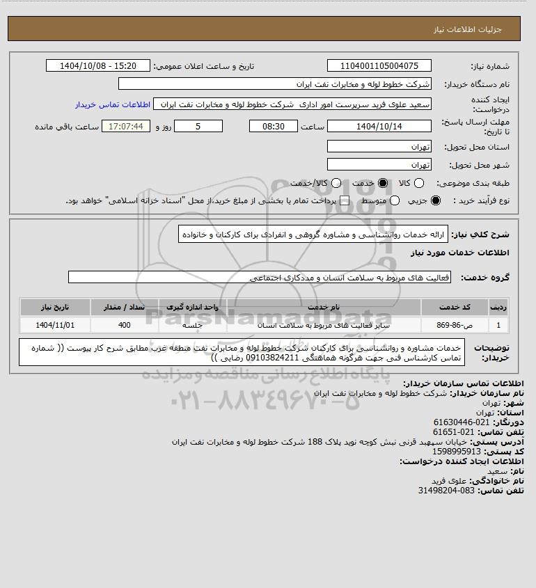 شرح کلی نیاز: ارائه خدمات روانشناسی و مشاوره گروهی و انفرادی برای کارکنان و خانواده