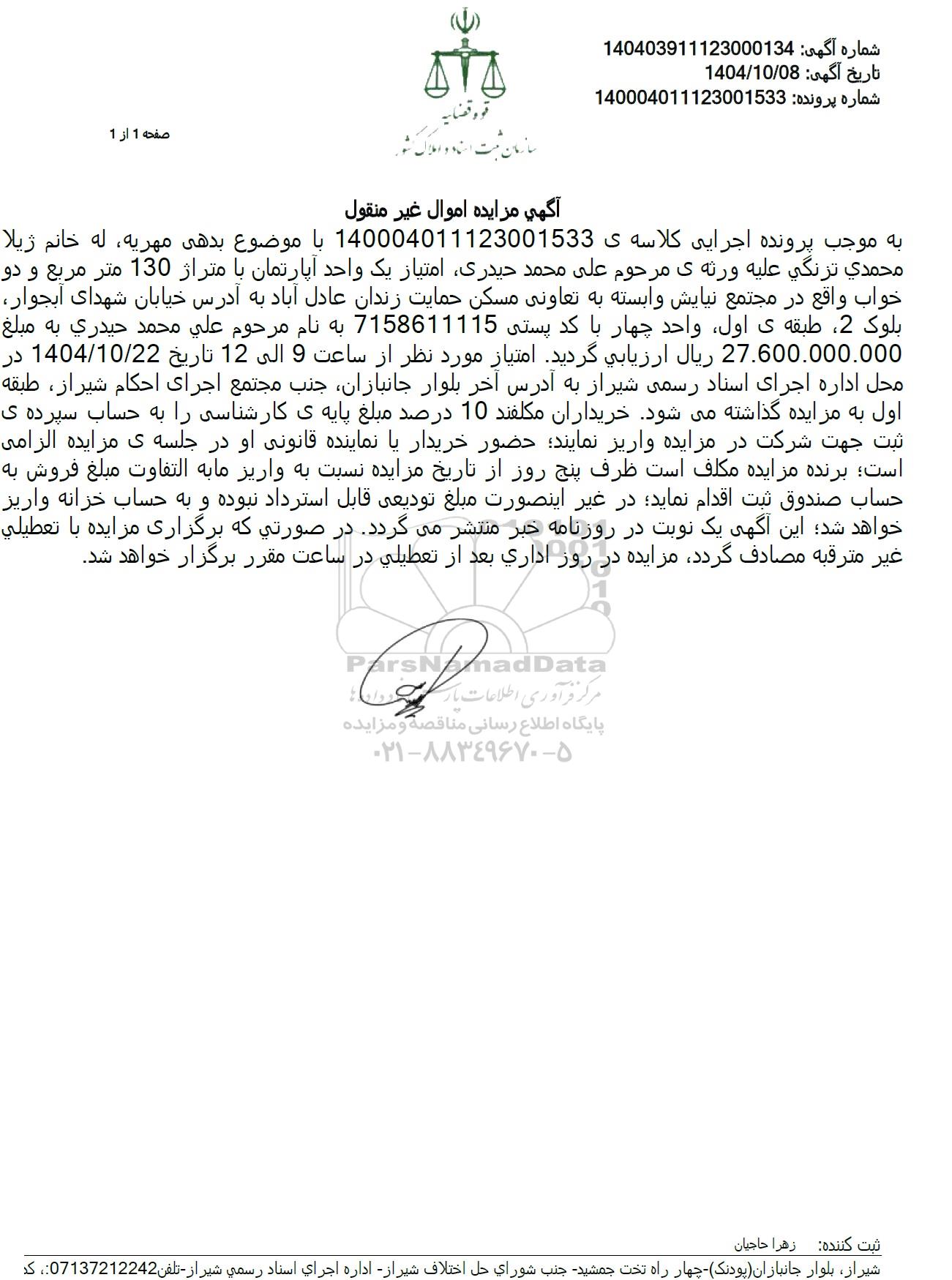 به موجب پرونده اجرایی کلاسه ی 140004011123001533 با موضوع بدهی مهریه له خانم ژیلا محمدی ترنگی علیه ورثه ی مرحوم علی محمد حیدری امتیاز یک واحد آپارتمان با متراژ 130 متر مربع و دو خواب واقع در مجتمع نیایش وابسته به تعاونی مسکن حمایت زندان عادل آباد به آدرس خیابان شهدای آبجوار بلوک 2 طبقه ی اول واحد چهار با کد پستی 7158611115 به نام مرحوم علی محمد حیدری به مبلغ 27.600.000.000 ریال ارزیابی گردید امتیاز مورد نظر از ساعت 9 الى 12 تاریخ 1404.10.22 در محل اداره اجرای اسناد رسمی شیراز به آدرس آخر بلوار جانبازان جنب مجتمع اجرای احکام شیراز طبقه اول به مزایده گذاشته میشود خریداران مکلفند 10 درصد مبلغ پایه ی کارشناسی را به حساب سپرده ی ثبت جهت شرکت در مزایده واریز نمایند؛ حضور خریدار یا نماینده قانونی او در جلسه ی مزایده الزامی است؛ برنده مزایده مکلف است ظرف پنج روز از تاریخ مزایده نسبت به واریز مابه التفاوت مبلغ فروش به حساب صندوق ثبت اقدام نماید؛ در غیر اینصورت مبلغ تودیعی قابل استرداد نبوده و به حساب خزانه واریز خواهد شد؛ این آگهی یک نوبت در روزنامه خبر منتشر میگردد در صورتی که برگزاری مزایده با تعطیلی غیر مترقبه مصادف گردد مزایده در روز اداری بعد از تعطیلی در ساعت مقرر برگزار خواهد شد.