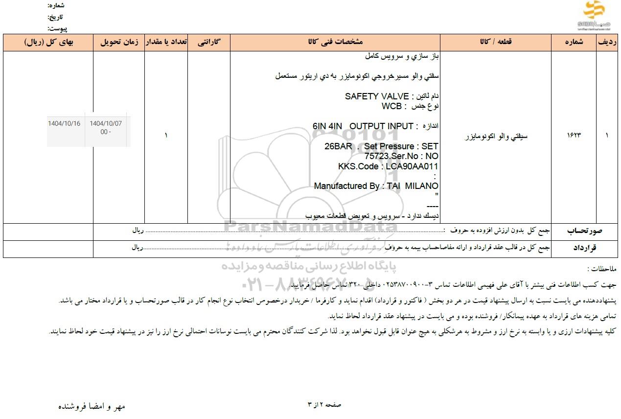 استعلام بها و موضوع استعلام استعلام سیفتی والو اكونومایزر به اطلاع کلیه شرکت‌ها و افراد متخصص واجد شرایط می‌رساند، آگهی گذار در نظر دارد از طریق استعلام بها، نسبت به انتخاب و دریافت پیشنهادات اقدام نماید. این استعلام با کد آگهی ثبت شده در سامانه خبرگزاری پارس نماد : 10071177 منتشر شده است. مشخصات استعلام : تاریخ شروع استعلام: 1404/10/08 آخرین مهلت ارسال پیشنهاد قیمت : 1404/10/16 و محل اجرای پروژه : استان مناقصات استان قم میباشد. استعلام قیمت مورد درخواست : استعلام سیفتی والو اكونومایزر با دسته‌بندی‌های تخصصی و گروه های مرتبط : شیرآلات, نیروگاه, تجهیزات برق و الکترونیک, استعلام اطلاع رسانی میگردد.