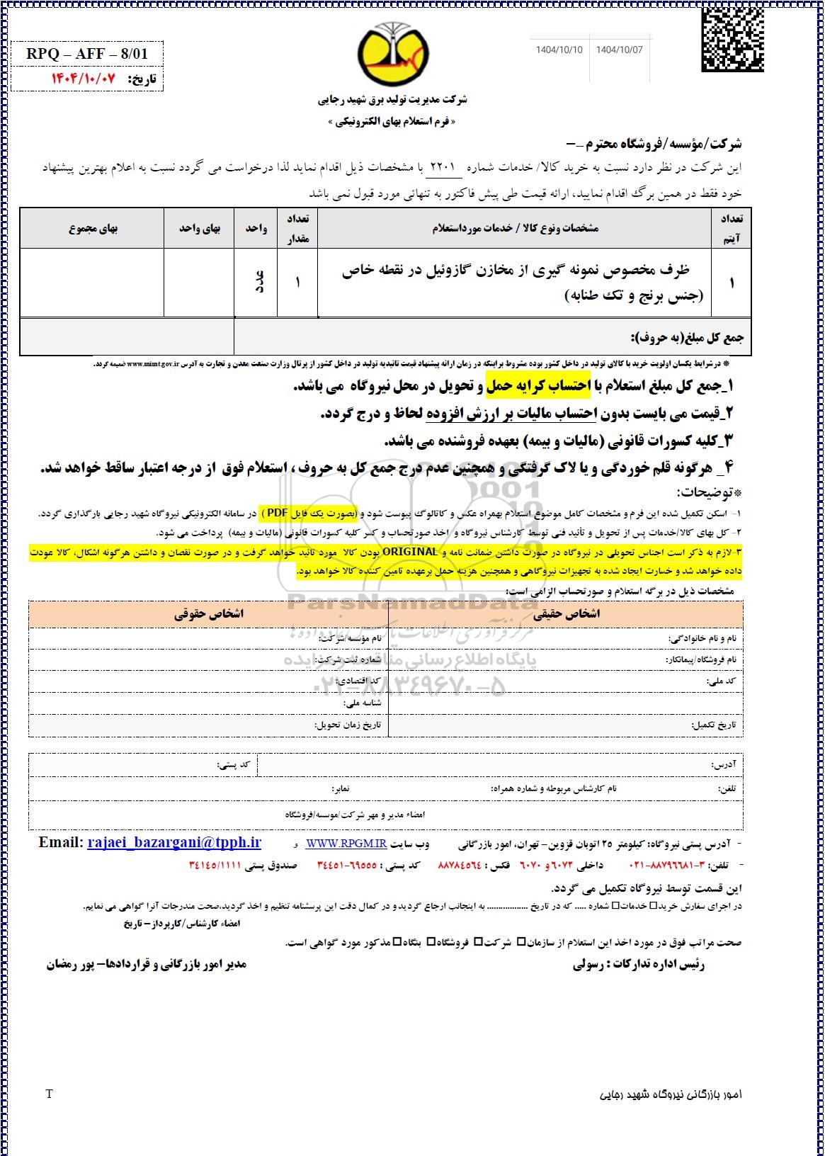 1- اسکن تکمیل شده این فرم و مشخصات کامل موضوع استعلام بهمراه عکس و کاتالوگ پیوست شود و (بصورت یک فایل PDF) در سامانه الکترونیکی نیروگاه شهید رجایی بارگذاری گردد.