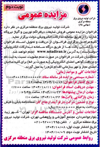 شرکت تولید نیروی برق منطقه مرکزی در نظر دارد فراخوان مزایده عمومی فروش ضایعات دیافراگم توربین و آلیاژ نیروگاه شازند را از طریق سامانه تدارکات الکترونیکی دولت برگزار نماید.