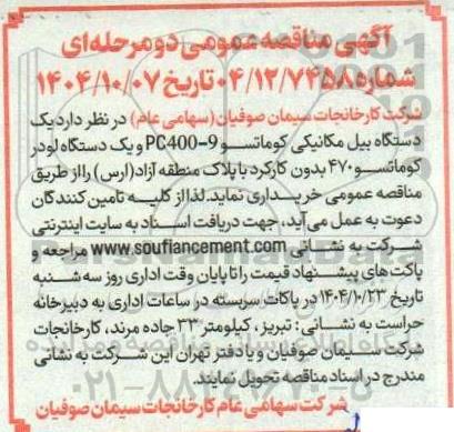 شرکت کارخانجات سیمان صوفیان (سهامی عام) در نظر دارد یک دستگاه بیل مکانیکی کوماتسو 9-PC400 و یک دستگاه لودر کوماتسو 470 بدون کارکرد با پلاک منطقه آزاد (ارس) را از طریق مناقصه عمومی خریداری نماید. لذا از کلیه تامین کنندگان دعوت به عمل می آید جهت دریافت اسناد به سایت اینترنتی شرکت به نشانی www.soufiancement.com مراجعه و پاکت های پیشنهاد قیمت را تا پایان وقت اداری روز سه شنبه تاریخ 1404.10.23 در پاکات سربسته در ساعات اداری به دبیرخانه حراست به نشانی: تبریز، کیلومتر 33 جاده مرند، کارخانجات شرکت سیمان صوفیان و یا دفتر تهران این شرکت به نشانی مندرج در اسناد مناقصه تحویل نمایند.