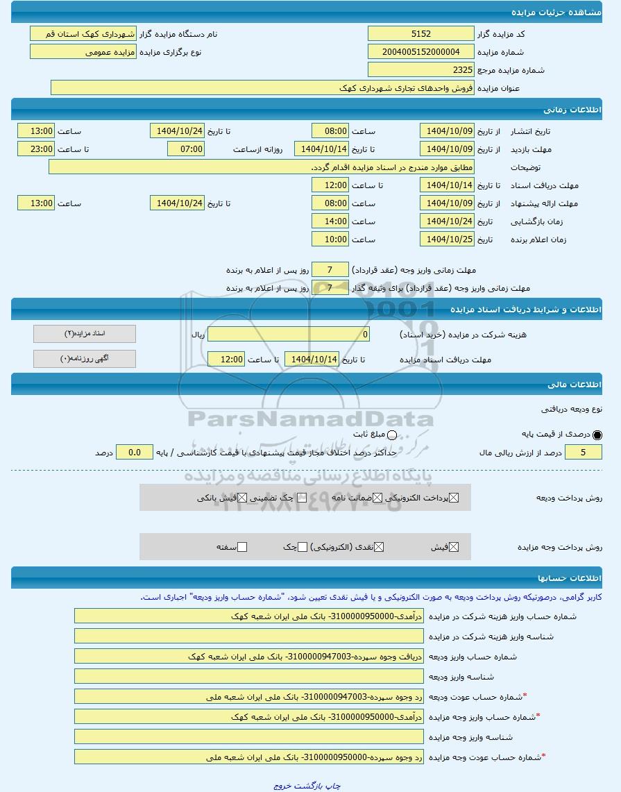 | عنوان مزایده | فروش واحدهای تجاری شهرداری کهک -مزایده واحد تجاری - استان قم | |||