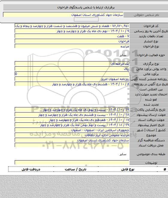 مزایده عمومی مزایده مزایده عمومی اجاره انبار دهاقان برگزار میگردد. از کلیه افراد متخصص و شرکت‌های واجد شرایط دعوت به عمل می‌آید تا در این مزایده با کد خبرگزاری پارس نماد : 10073698 شرکت نمایند تاریخ شروع مزایده : 1404/10/09 مهلت شرکت در مزایده: تا پایان روز 1404/10/17 مکان برگزاری اموال واگذاری استان‌های مزایدات استان اصفهان و دسته‌بندی‌های مربوط به این حراجی واگذاری ورزشگاه، پارکینگ، غرفه و بوفه میباشد.