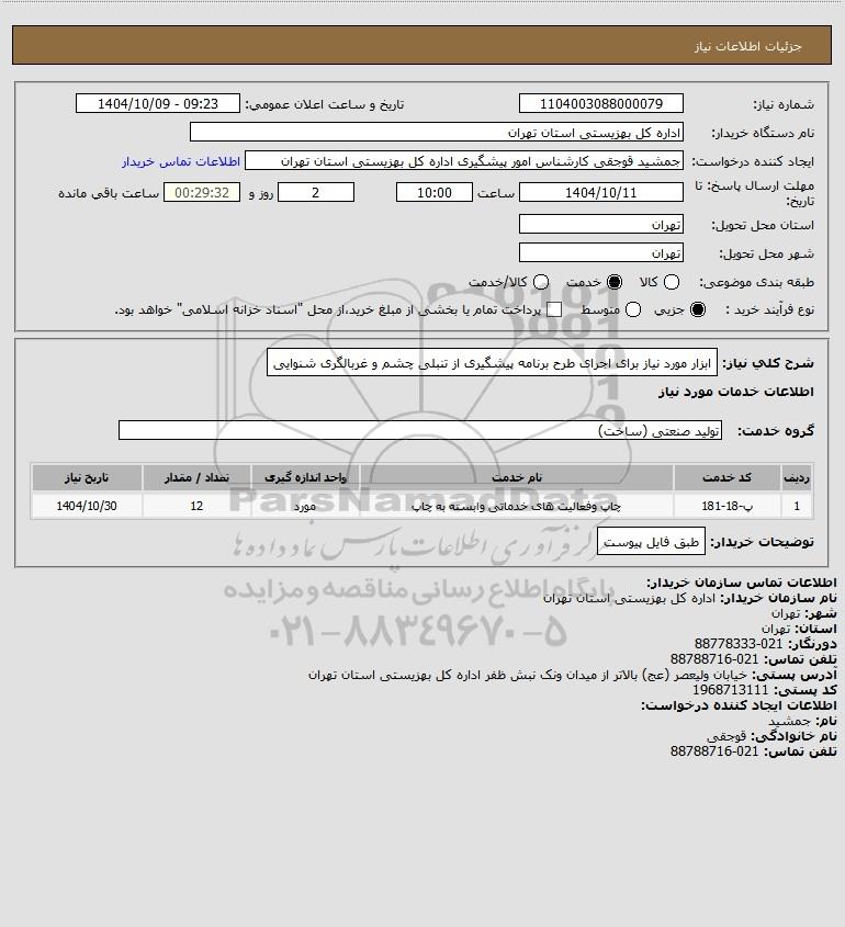 شرح کلی نیاز: ابزار مورد نیاز برای اجرای طرح برنامه پیشگیری از تنبلی چشم و غربالگری شنوایی