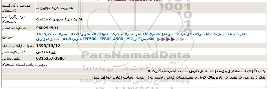 موضوع : استعلام تلفر 3 تنی سیم بکسلی برقی دو بارابان ، ارتفاع بالابری 18 متر ، سرعت حرکت طولی 20 متر بر دقیقه ، سرعت بالابری 16 متر بر دقیقه ، سایز منو ریل IPE500 - A500 - IPBHE کلاس کاری M5