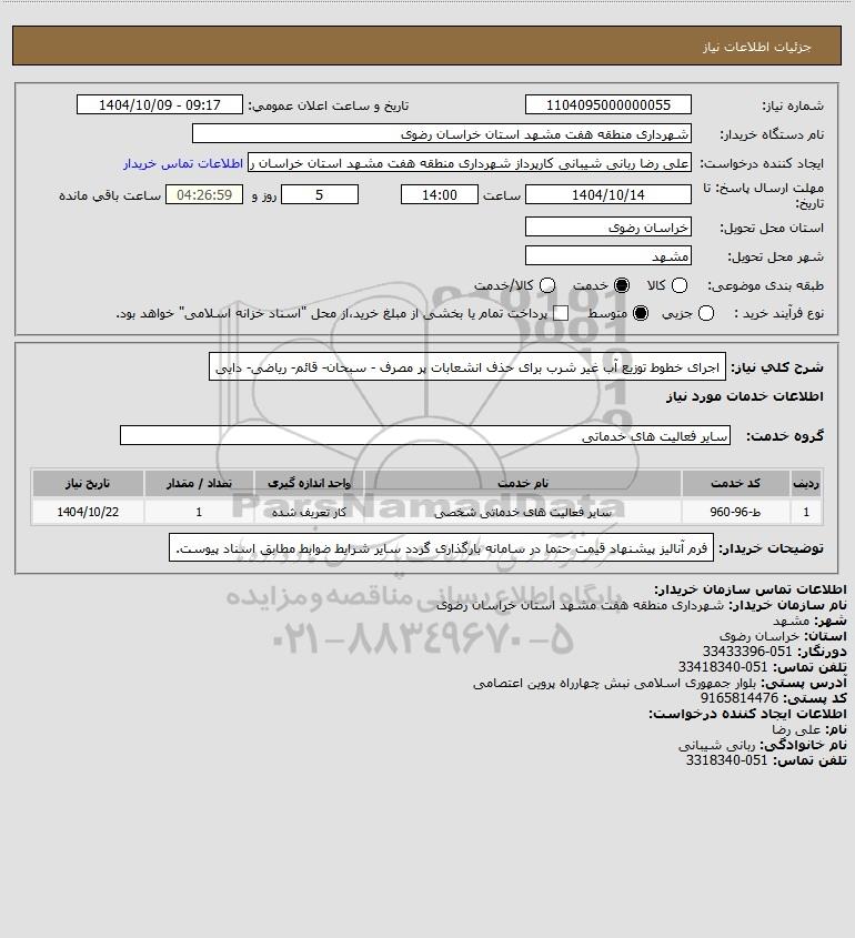 شرح کلی نیاز: اجرای خطوط توزیع آب غیر شرب برای حذف انشعابات پر مصرف - سبحان- قائم- ریاضی- دایی