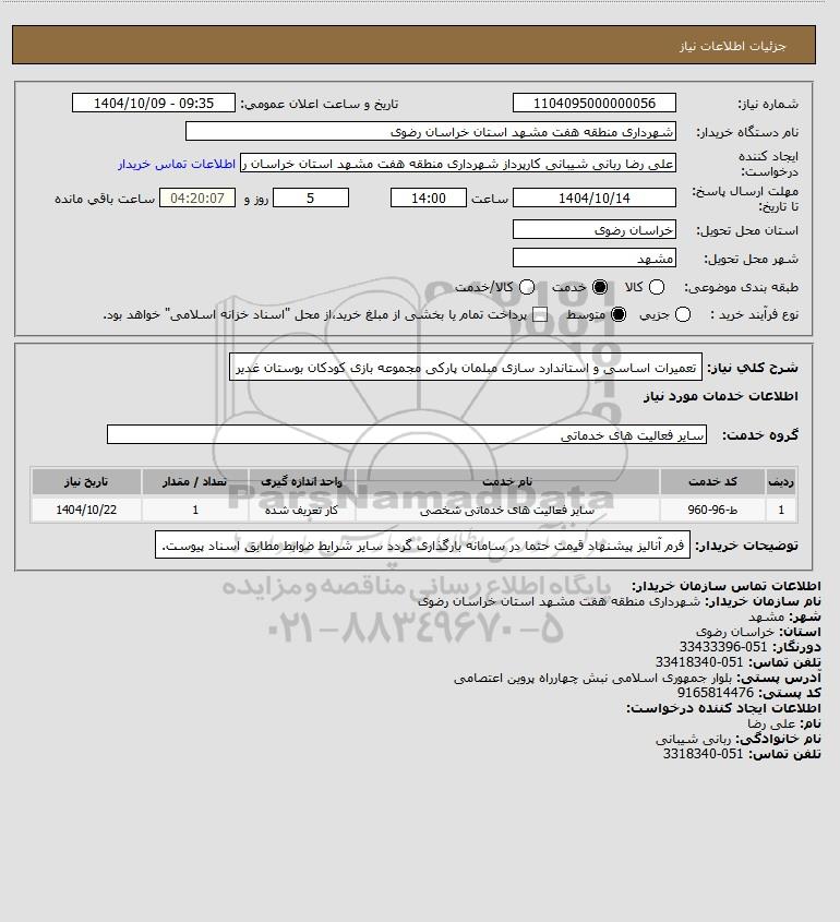 شرح کلی نیاز: تعمیرات اساسی و استاندارد سازی مبلمان پارکی مجموعه بازی کودکان بوستان غدیر