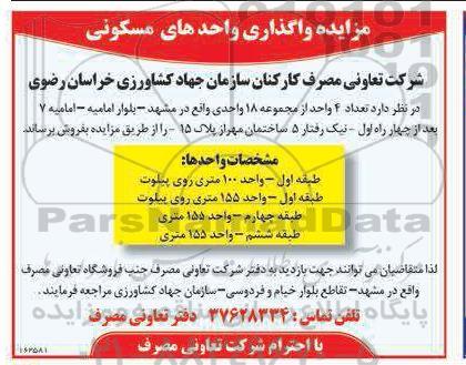 مزایده عمومی مزایده واگذاری واحدهای مسکونی برگزار میگردد. از کلیه افراد متخصص و شرکت‌های واجد شرایط دعوت به عمل می‌آید تا در این مزایده با کد خبرگزاری پارس نماد : 10074799 شرکت نمایند تاریخ شروع مزایده : 1404/10/09 مهلت شرکت در مزایده: تا پایان روز 1404/10/29 مکان برگزاری اموال واگذاری استان‌های مزایدات استان خراسان رضوی و دسته‌بندی‌های مربوط به این حراجی املاک و زمین میباشد.