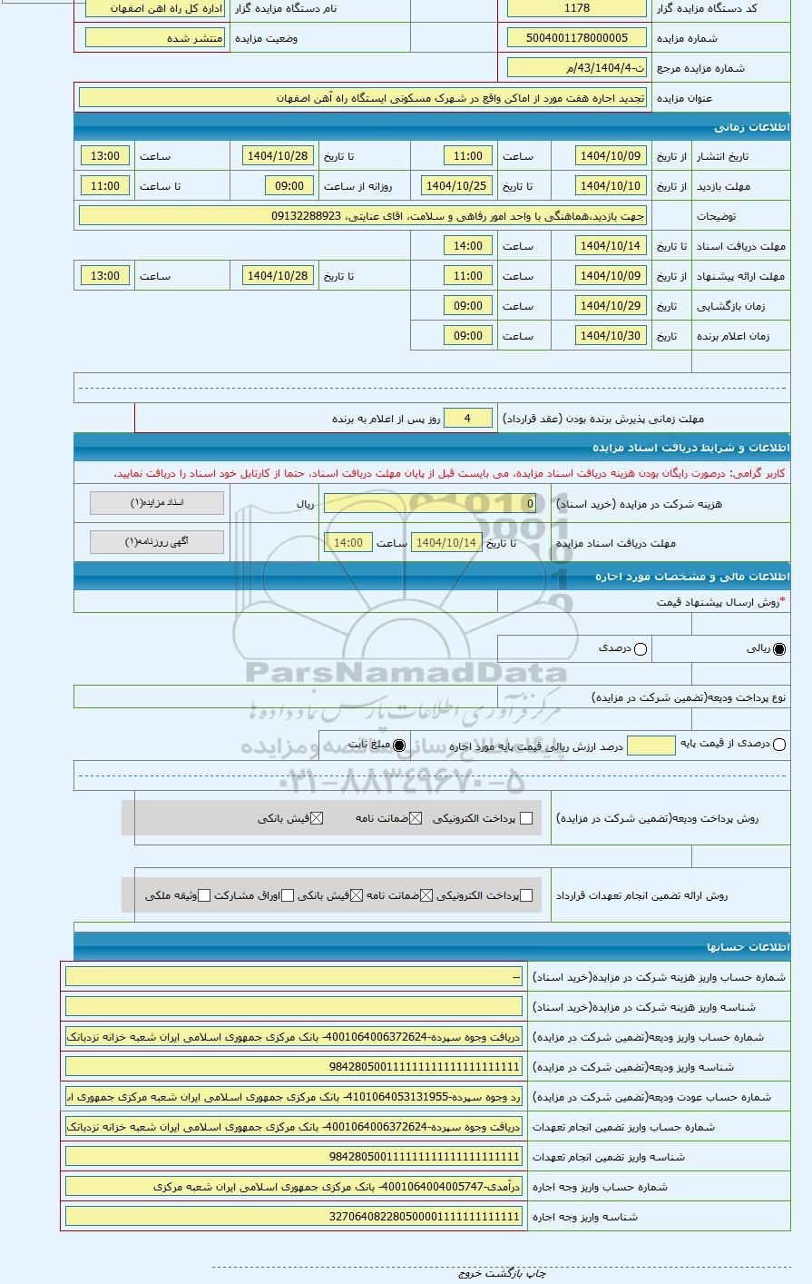 | شماره حساب عودت وجه مزایده | 327064082280500001111111111111 |