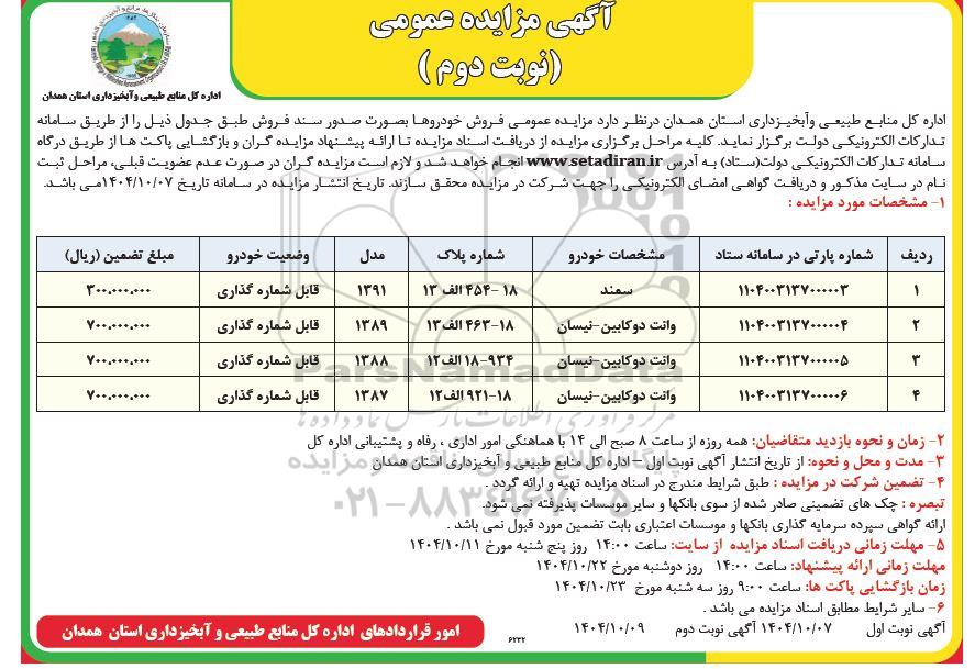 اداره کل منابع طبیعی و آبخیزداری استان همدان در نظر دارد مزایده عمومی فروش خودروها بصورت صدور سند فروش طبق جدول ذیل را از طریق سامانه تدارکات الکترونیکی دولت برگزار نماید . کلیه مراحل برگزاری مزایده از دریافت اسناد مزایده تا ارائه پیشنهاد مزایده گران و بازگشایی پاکت ها از طریق درگاه سامانه تدارکات الکترونیکی دولت (ستاد) انجام خواهد شد و لازم است مزایده گران در صورت عدم عضویت قبلی مراحل ثبت نام در سایت مذکور و دریافت گواهی امضای الکترونیکی را جهت شرکت در مزایده محقق سازند . تاریخ انتشار مزایده در سامانه تاریخ 1404.10.07 می باشد.