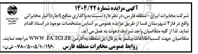 شرکت مخابرات ایران - منطقه فارس در نظر دارد نسبت به واگذاری منافع (اجاره) انبار مخابراتی واقع در فاز 2 شهرستان فسا از طریق مزایده عمومی براساس مشخصات موجود در اسناد اقدام نماید. لذا از کلیه متقاضیان واجد شرایط دعوت به عمل می آید. متقاضیان جهت کسب اطلاعات بیشتر به پرتال این منطقه به آدرس WWW.FA.TCI.IR مراجعه نمایند.