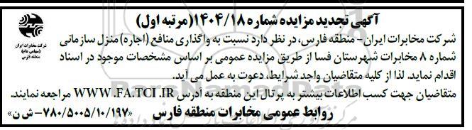 شرکت مخابرات ایران - منطقه فارس در نظر دارد نسبت به واگذاری منافع (اجاره) منزل سازمانی شماره 8 مخابرات شهرستان فسا از طریق مزایده عمومی بر اساس مشخصات موجود در اسناد اقدام نماید. لذا از کلیه متقاضیان واجد شرایط دعوت به عمل می آید متقاضیان جهت کسب اطلاعات بیشتر به پرتال این منطقه به آدرس WWW.FA.TCI.IR مراجعه نمایند.