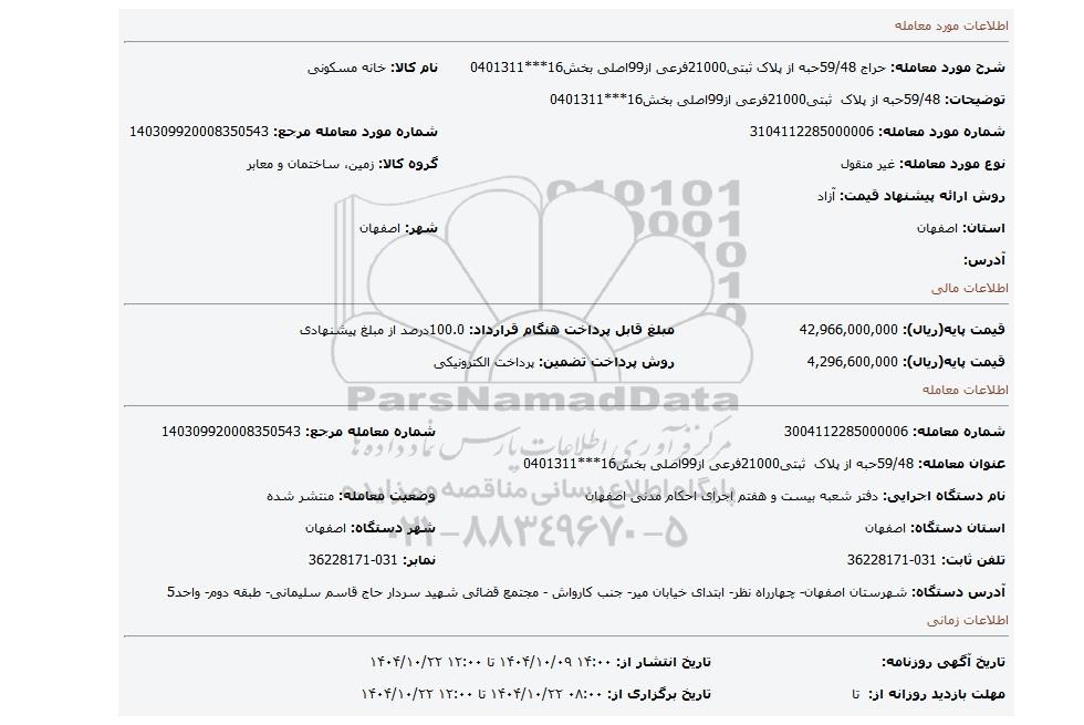 | شماره مورد معامله: 3104112285000006 | شماره مورد معامله مرجع: 140309920008350543 | |