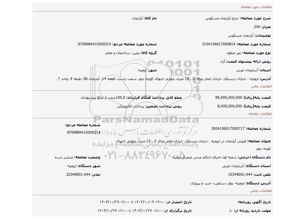 | شرح مورد معامله: حراج آپارتمان مسکونی | نام کالا: آپارتمان | |