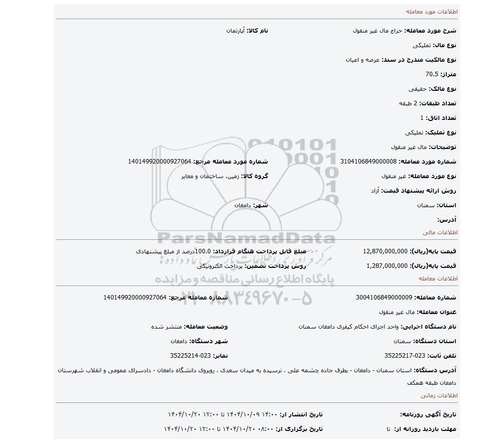 | شرح مورد معامله: حراج مال غیر منقول | نام کالا: آپارتمان | |