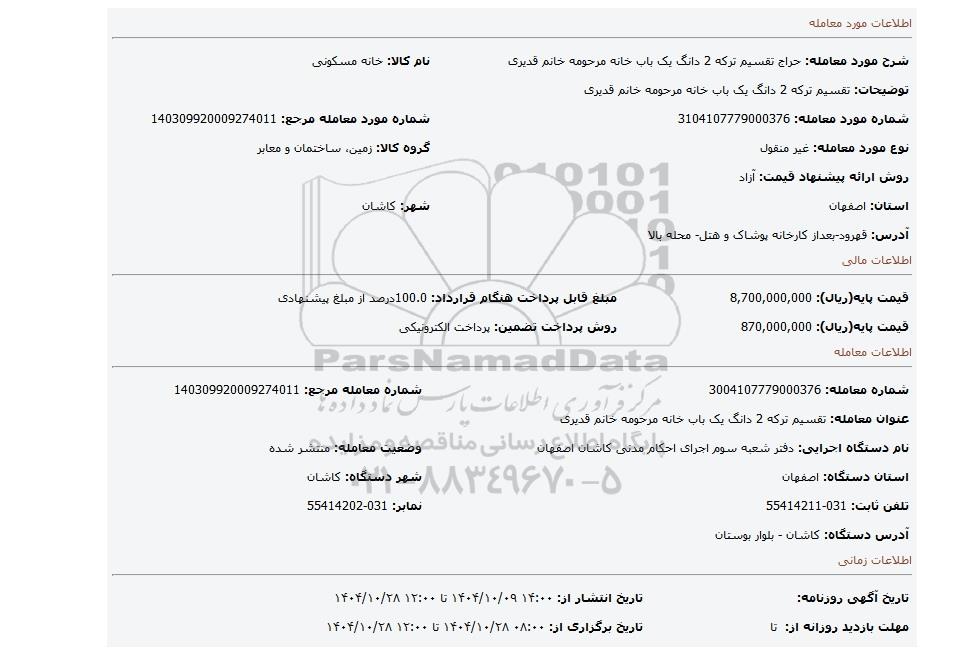 | عنوان معامله: تقسیم ترکه 2 دانگ یک باب خانه مرحومه خانم قدیری | ||