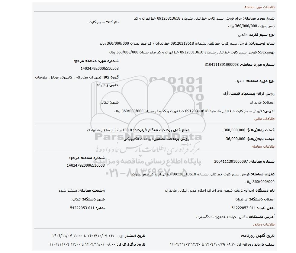 | شماره مورد معامله: 3104111391000098 | شماره مورد معامله مرجع: 140347920006516503 | |