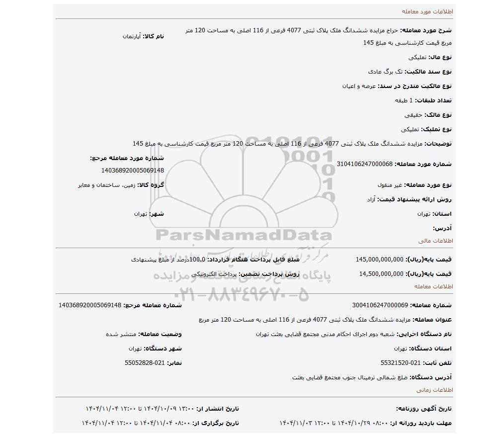شرح مورد معامله: حراج مزایده ششدانگ ملک پلاک ثبتی 4077 فرعی از 116 اصلی به مساحت 120 متر مربع قیمت کارشناسی به مبلغ 145نام کالا: آپارتمان