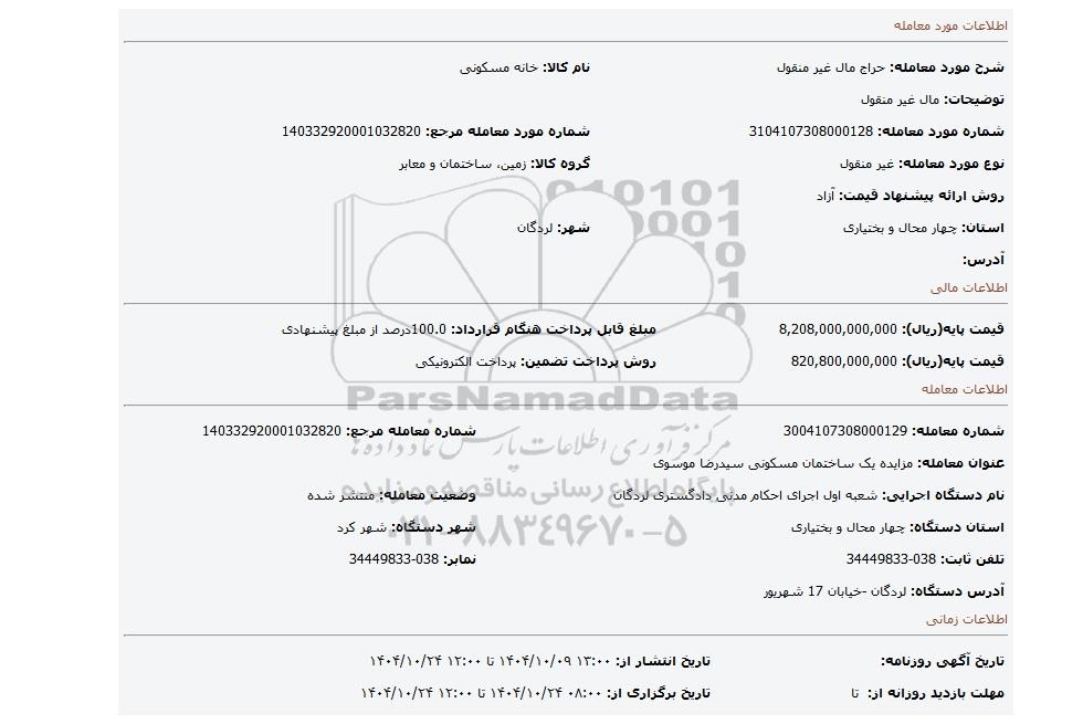 نام دستگاه اجرایی: شعبه اول اجرای احکام مدنی دادگستری لردگانوضعیت معامله: منتشر شده
