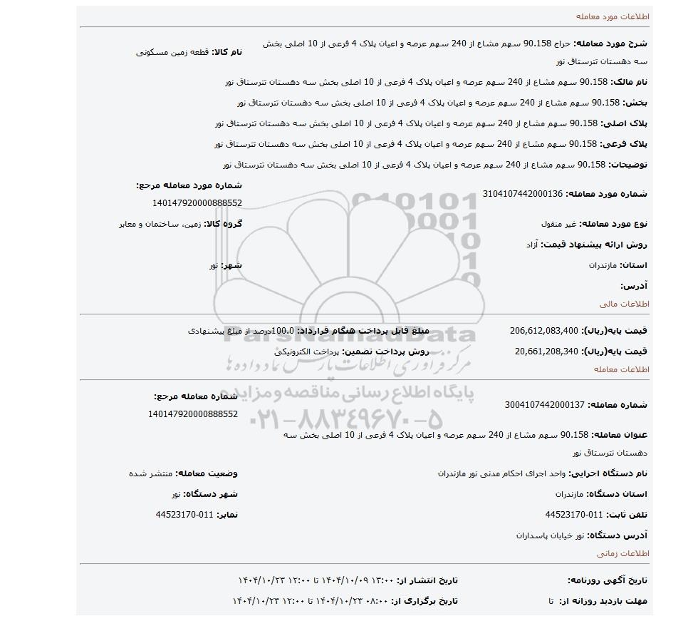 مزایده 90.158 سهم مشاع از 240 سهم عرصه و اعیان پلاک 4 فرعی از 10 اصلی بخش سه دهستان تترستاق نور, مزایده، 90.158 سهم مشاع از 240 سهم عرصه و اعیان پلاک 4 فرعی از 10 اصلی بخش سه دهستان تترستاق نور