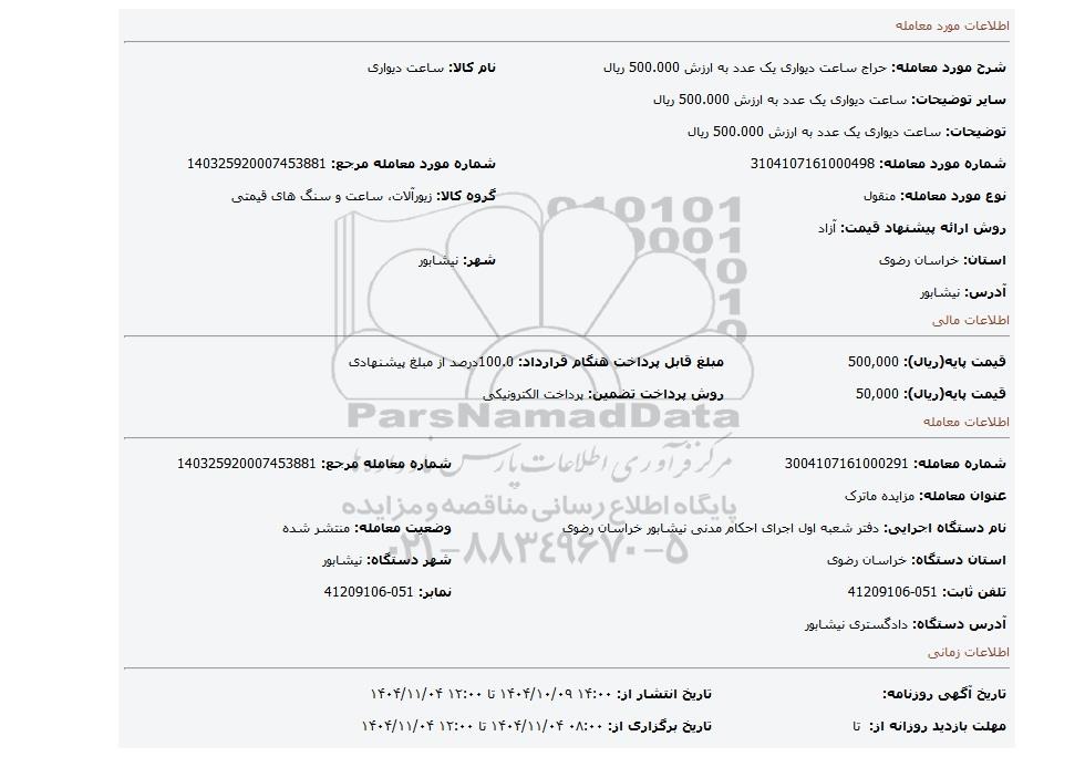 | شماره مورد معامله: 3104107161000498 | شماره مورد معامله مرجع: 140325920007453881 | |