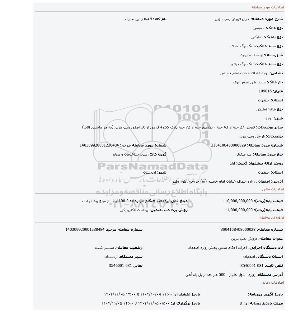 | قیمت پایه(ریال): 11,000,000,000 | روش پرداخت تضمین: پرداخت الکترونیکی |