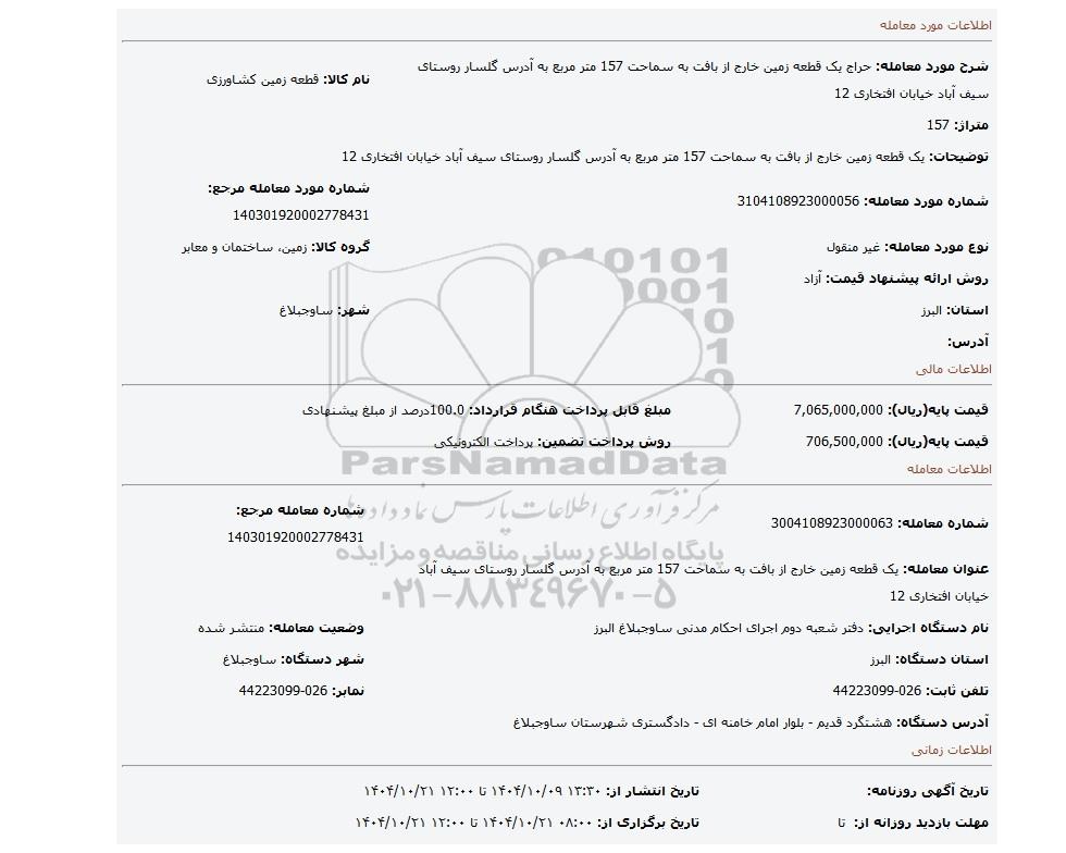 مزایده عمومی مزایده یک قطعه زمین خارج از بافت به سماحت 157 متر مربع به آدرس گلسار روستای سیف آباد خیابان افتخاری 12 برگزار میگردد. از کلیه افراد متخصص و شرکت‌های واجد شرایط دعوت به عمل می‌آید تا در این مزایده با کد خبرگزاری پارس نماد : 10077580 شرکت نمایند تاریخ شروع مزایده : 1404/10/09 مهلت شرکت در مزایده: تا پایان روز 1404/10/21 مکان برگزاری اموال واگذاری استان‌های مزایدات استان البرز و دسته‌بندی‌های مربوط به این حراجی ماشین آلات و تجهیزات کشاورزی و دام پروری, املاک و زمین میباشد.