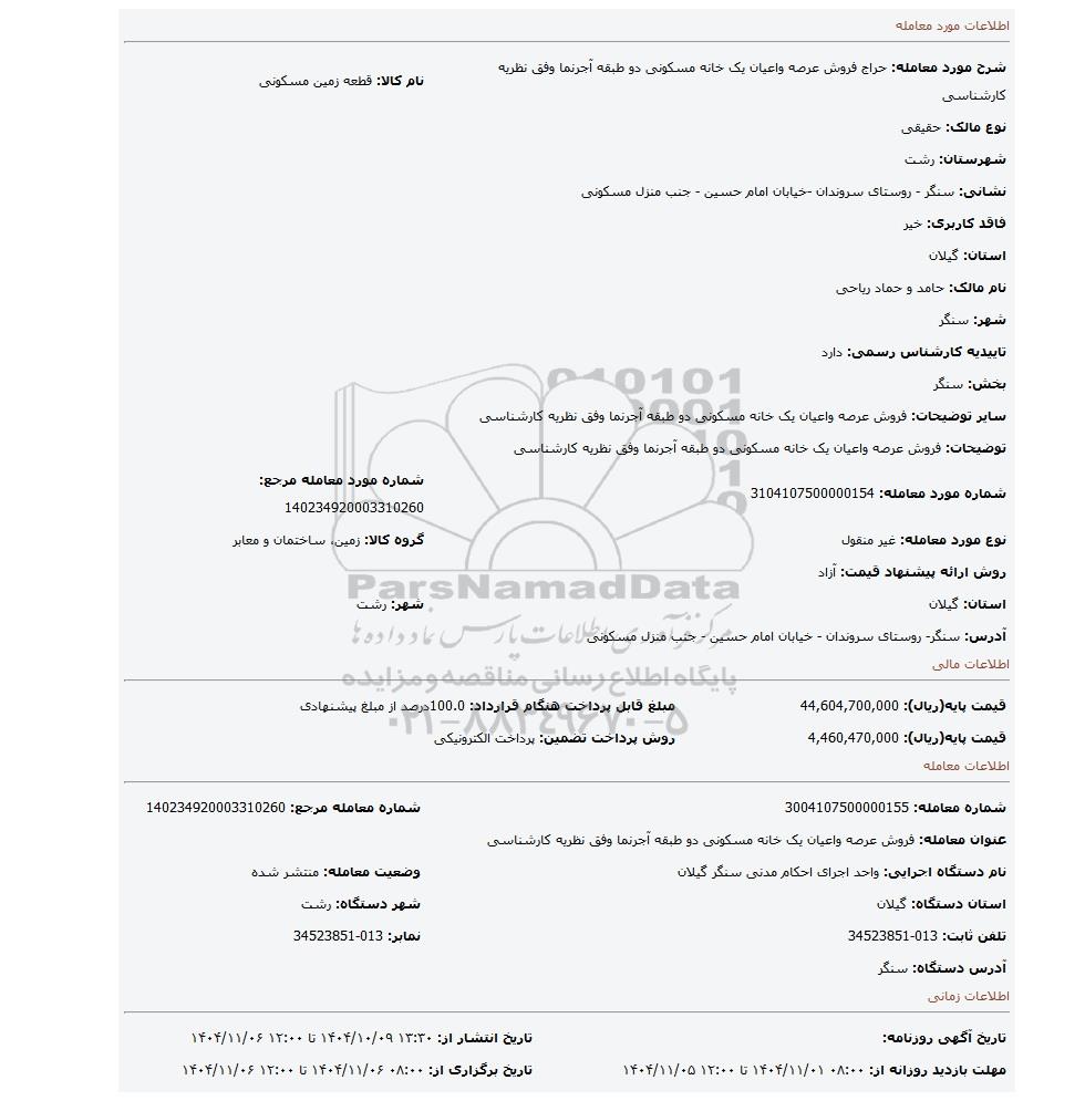 | شماره مورد معامله: 3104107500000154 | شماره مورد معامله مرجع: 140234920003310260 | |