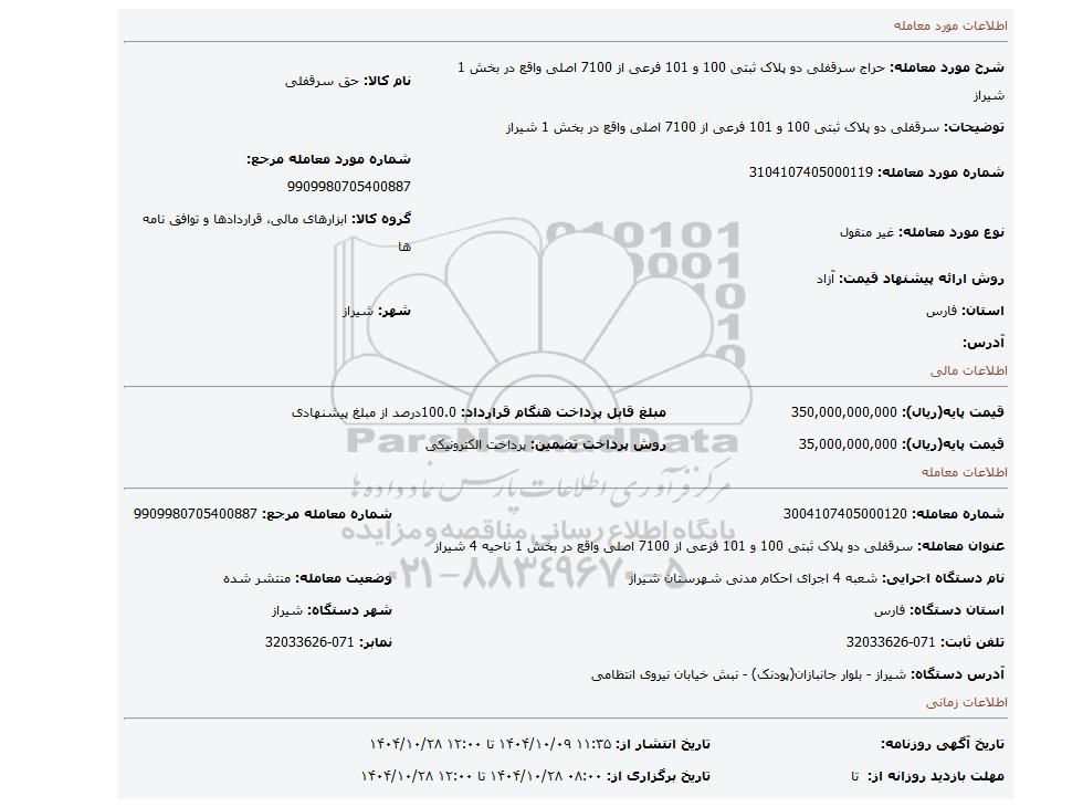 | عنوان معامله: سرقفلی دو پلاک ثبتی 100 و 101 فرعی از 7100 اصلی واقع در بخش 1 ناحیه 4 شیراز | ||
