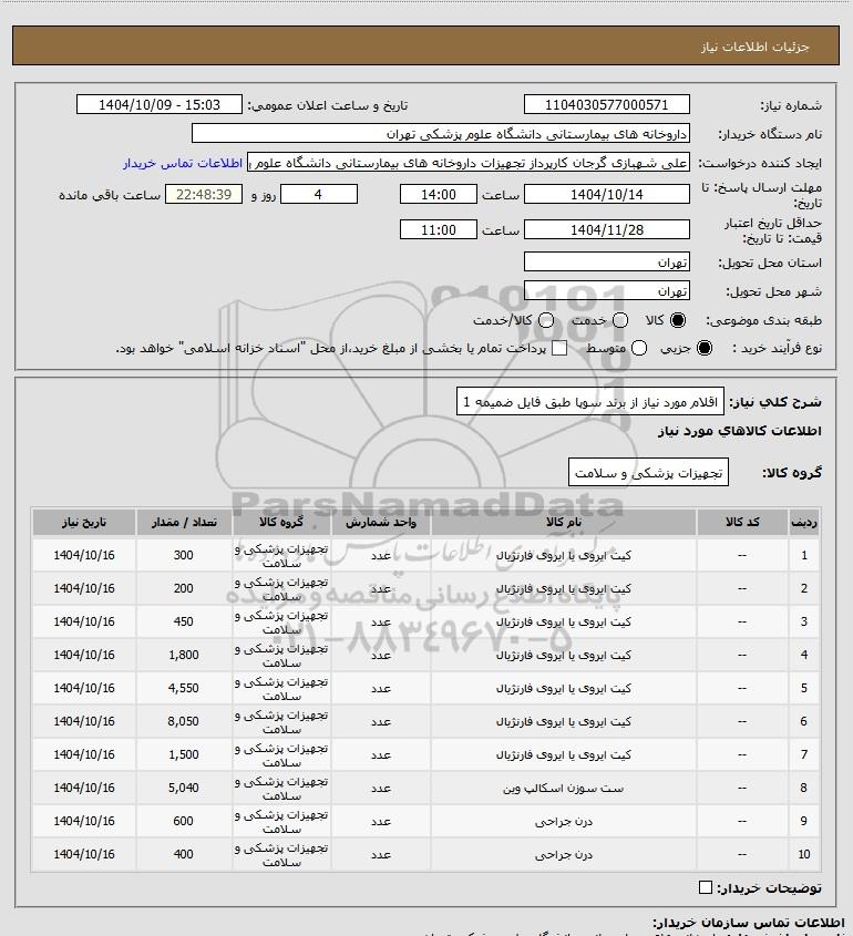 | 1 | -- | کیت ایروی یا ایروی فارنژیال | عدد | تجهیزات پزشکی و سلامت | 300 | 1404/10/16 |
