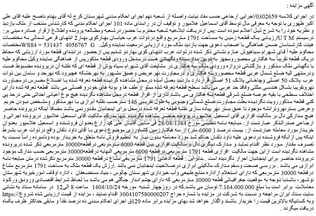 در اجرای کلاسه 0302659/اجرایی ارجاعی حسب مفاد نیابت واصله از شعبه نهم اجرای احکام مدنی شهرستان کرج له آقای بهنام ناصح علیه اقای علی اکبر ظهوری با توجه به معرفی مال توسط آقای اسماعیل غلامپور و توقیف آن در راستای ماده 101 اجرای احکام مدنی که کارشناس منتخب از ملک بازدید و نظریه خود را به شرح ذیل اعلام نموده است :پس ازدریافت ابلاغیه شعبه محترم با حضوردرشعبه ومطالعه پرونده واطلاع ازقرار صادره مبنی بر: ارزیابی یک قطعه زمین به مساحت 1791 مترمربع واقع درذوات غرب خیابان بهارکوی بهار2 انتهای فرعی شمالی به مختصاتutm درسیستم مختصاتws84 = 531437 4056767 g . هیئت کارشناسان ضمن هماهنگی با اصحاب دعوی جهت بازدید ملک مورد ارزیابی درمعیت نماینده وکیل محکوم علیه آ قای شهرام سیاهپوش عازم نشانی ذکر شده درذوات غرب انتهای کوی بهاردو شدیم پس ازحضور درابتدای قطعه مورد ارزیابی که محاط دریک قطعه تقریباً سه هکتاری محصورومجهز به دوبین مداربسته ونگهبانی هست درمدخل ورودی قطعه مذکورپس از هماهنگی نماینده وکیل محکوم علیه با نگهبانی ملک مذکور و بازگشائی دروازه ورودی ملک سه هکتاری در مشایعت آقای شهرام سیاه پوش از قطعه ای که نقشه آن درپرونده مضبوط هست ودرمنتهی الیه ضلع شمال غربی قطعه محصوروسه هکتاری و درمجاورت نهرعریض وعمیق مشهور به نهرخشکه هچیرود که نهرحد و سامان بین ذوات غرب پلاک 50 اصلی وچاخانی پلاک 51 اصلی قراردارد بازدید بعمل آمده درمحل مشاهده گردیده قطعه تعرفه شده با اضلاع مضرس درمجاورت نهروتقریبا بشکل هندسی مثلثی وفاقد حد غربی می باشد سطح قطعه تعرفه شده مملو ازعلف ها و بوته های خودرو فصلی می باشد قطعه تعرفه شده دارای اختلاف سطحی با بقیه عرصه ضلع شرقی قطعه سه هکتاری می باشد آثاری از افراز قطعه درمحل مشاهده نگردیده هیچ نوع اعیانی احداثی حتی درحد پی کنی قطعه مذکوررویت نگردیده بعلت مجاورت ضلع شمالی وجنوبی به طول تقریبی 146 مترحسب نقشه ابرازی با نهرمذکور ومشخص نبودن حریم وعرض بسترنهروترانشه موجود تا عمق بستر نهر پیاده سازی نقشه قطعه تعرفه شده درمحل برای اینجانبان مقدورنمی باشد مضافاً اینکه درپرونده حاضر هیچ مدارکی دال بر مالکیت افرازی آقای اسمعیل غلامپوردرپرونده حاضر مشاهده نگردیده .تنها مدرک مالکیت آقای اسمعیل غلامپور درپرونده اجرائی و ارجاعی صدرالذکر عبارتست از: مبایعه نامه تنظیمی مورخ 28/08/1384 فی مابین آقایان علی محمد زارع بعنوان فروشنده و اسمعیل غلامپور بعنوان خریدارمورد معامله عبارتست از: بیست درصد ( 6000 متر) از سه هکتارزمین کشاورزی موضوع دعوی با آقای داود دلفان واقع درذوات غرب بشرط اینکه پس ازآنکه فروشنده دردعوی علیه داود دلفان حاکم شد مورد معامله بدون نیاز به تنطیم فروش نامه متعلق به خریدار بوده ونامبرده راساً نسبت به تصرف مقدار مورد نظر اقدام نماید و مدارک دیگری دال برمالکیت افرازی بین قطعه 6000 مترمربعی درقطعه30000 مترمربعی ذکر شده درپرونده مشاهده نگردیده است ازاین جهت مالکیت افرازی قطعه 1791 مترمربعی درقطعه 6000 مترمربعی النهایه درقطعه30000 مترمربعی حسب مدارک موجود درپرونده حاضر برای اینجانبان احراز نگردیده است . بنابراین : قطعه ادعائی 1791 مترمربعی مشاع درقطعه 30000 مترمربع ذکرشده درمتن مبایعه نامه ابرازی می باشد . بررسی صحت وسقم مدارک مالکیتی ابرازی درصلاحیت اینجانبان نمی باشد .ارزش یک قطعه ملک به مساحت 1791 مترمربع مشاع درقطعه 30000 مترمربعی که دارای استعلام ازاداره منابع طبیعی وآب خیزداری شهرستان چالوس ، بنیاد مستضعفان ، اداره اوقاف امورخیریه شهرستان نوشهر، باشدبا توجه به موقعیت جغرافیائی قطعه 30000 مترمربعی که دارای چشم اندار جنگلی هم می باشد با لحاظ شرایط اقتصادی ورونق ورکود معاملات برابر است با مبلغ 7.164.000.000 تومان می باشد.که در روزچهار شنبه مورخه 1404/10/24 ساعت 8 الی12 در سامانه ستاد به نشانی سایت ستاد ایران مراجعه و نسبت به شرکت در مزایده با شماره حراج 3004107580000207 اقدام نمایند ، مزایده از قیمت ارزیابی شده شروع وبه کسان