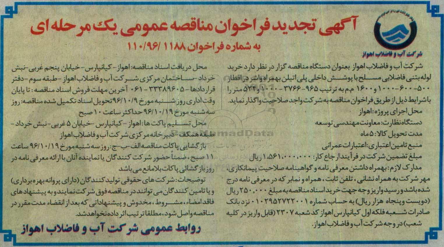 شرکت آب و فاضلاب اهواز به عنوان دستگاه مناقصه گزار در نظر دارد خرید لوله بتنی فاضلابی مسلح با پوشش داخلی پلی اتیلن بهمراه واشر در اقطار 500-600-1000 و 1600 م.م به ترتیب 965-3766-1000 و 524 متر را با شرایط ذیل از طریق فراخوان مناقصه به شرکت واجد صلاحیت واگذار نماید