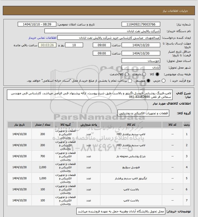 شرح کلی نیاز: لامپ،فتینگ روشنایی،فتوسل،اگنیتور و بالاست طبق شرح پیوست. ارائه پیشنهاد فنی الزامی میباشد. کارشناس فنی مهندس سمائی فر تلفن 53182690-061