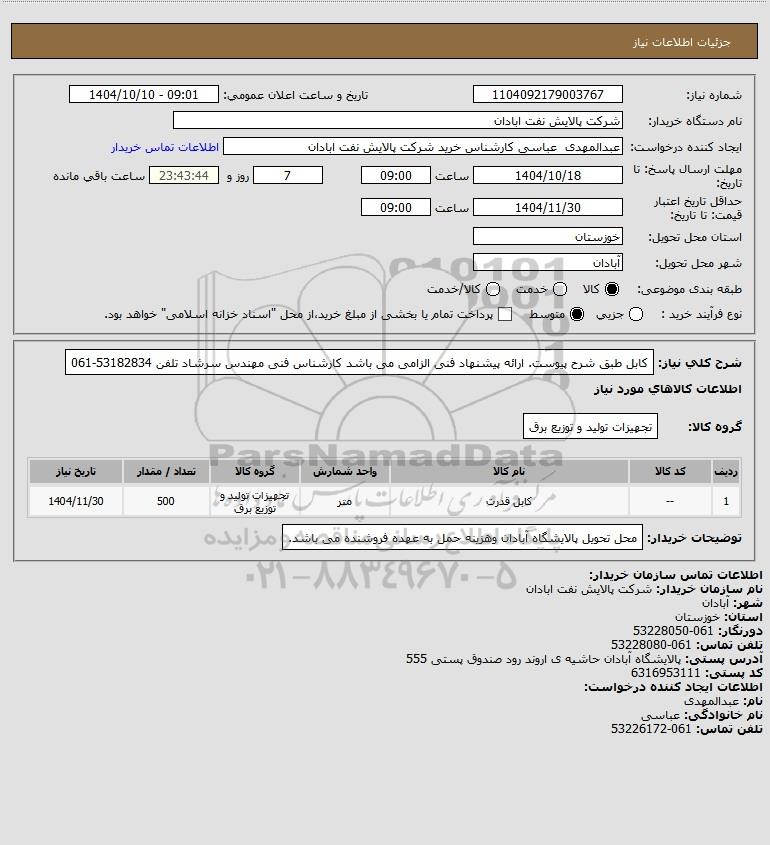 شرح کلی نیاز: کابل طبق شرح پیوست. ارائه پیشنهاد فنی الزامی می باشد کارشناس فنی مهندس سرشاد تلفن 53182834-061