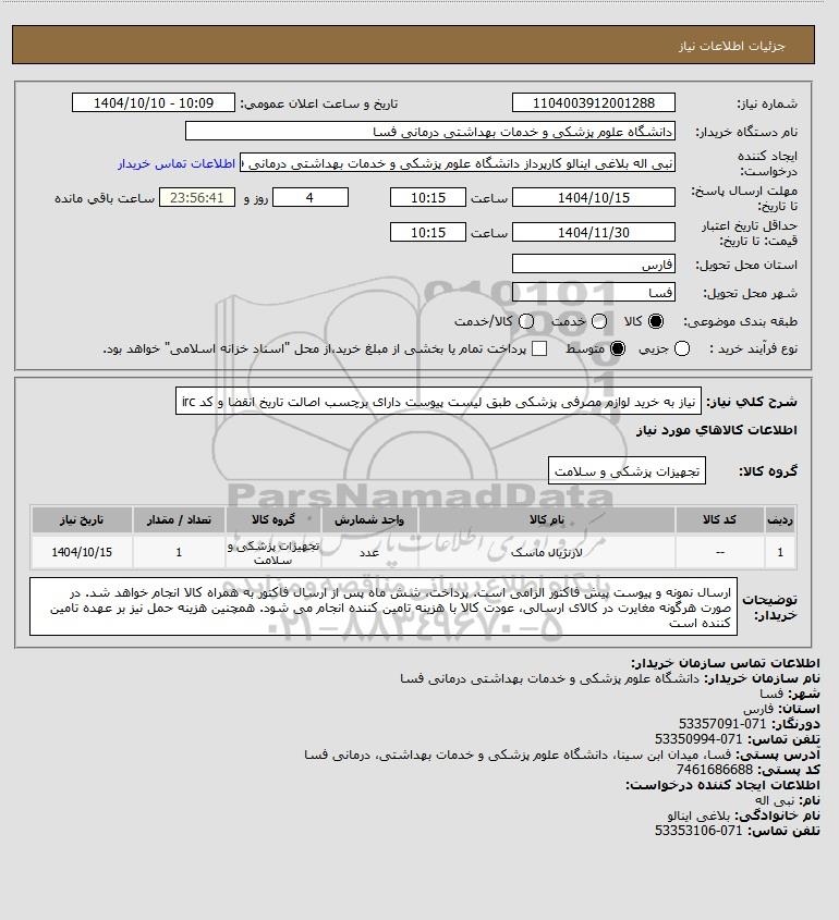 شرح کلی نیاز: نیاز به خرید لوازم مصرفی پزشکی طبق لیست پیوست دارای برچسب اصالت تاریخ انقضا و کد irc
