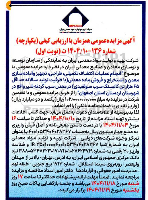 شرکت تهیه و تولید مواد معدنی ایران به نمایندگی از سازمان توسعه و نوسازی معادن و صنایع معدنی ایران در نظر دارد مزایده عمومی با موضوع انجام عملیات اکتشاف تکمیلی ، طراحی تجهیز و آماده سازی معدن و استخراج و فروش ماده معدنی (با ظرفیت تولید سالانه حداقل 65 هزار تن کانسنگ سرب سولفیدی) در معدن سرب گردنه شیر واقع در شهرستان اردستان استان اصفهان را از طریق مزایده عمومی و با تضمین شرکت در مزایده به مبلغ 102.000.000.000 ریال (یکصد و دو میلیارد ریال) واریز نقدی با ضمانت نامه بانکی را اجرا نماید. لذا بدینوسیله از علاقمندان دعوت تعمل می آید حیث کسب اطلاعات بیشتر و تهیه اسناد مزایده از تاریخ 1404.10.10 و حداکثر تا ساعت 16 مورخ 1404.11.4 با در دست داشتن معرفی نامه و اصل فیش واریزی به مبلغ 4 میلیون ریال بحساب 4001053404028367 با عنوان تمرکز وجوه شرکت های دولتی - شرکت تهیه و تولید مواد معدنی ایران به شماره شبا 350100004001053404028367 IR و شناسه واریز 30 رقمی به شماره 38805348223017071101027624719 نزد بانک مرکزی جمهوری اسلامی ایران به آدرس: تهران بالاتر از میدان ولیعصر - روبروی سینما استقلال - شماره 1713 برج جنوبی - طبقه نهم - مدیریت امور حقوقی و قراردادها دفتر امور اسناد مناقصه و مزایده مراجعه نمایند.