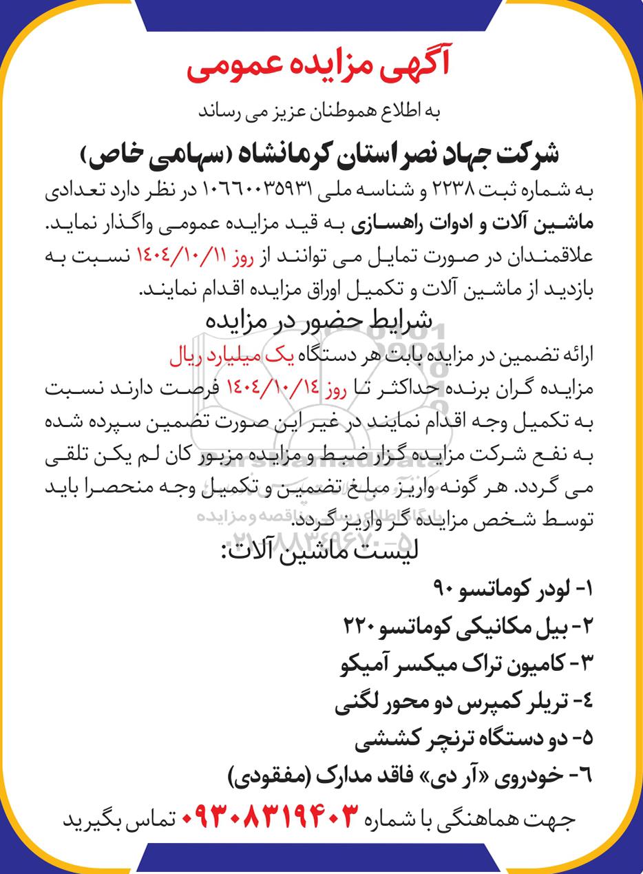 شرکت جهاد نصر استان کرمانشاه (سهامی خاص) به شماره ثبت 2238 و شناسه ملی 10660035931 در نظر دارد تعدادی ماشین آلات و ادوات راهسازی به قید مزایده عمومی واگذار نماید. علاقمندان در صورت تمایل می توانند از روز 1404.10.11 نسبت به بازدید از ماشین آلات و تکمیل اوراق مزایده اقدام نمایند.