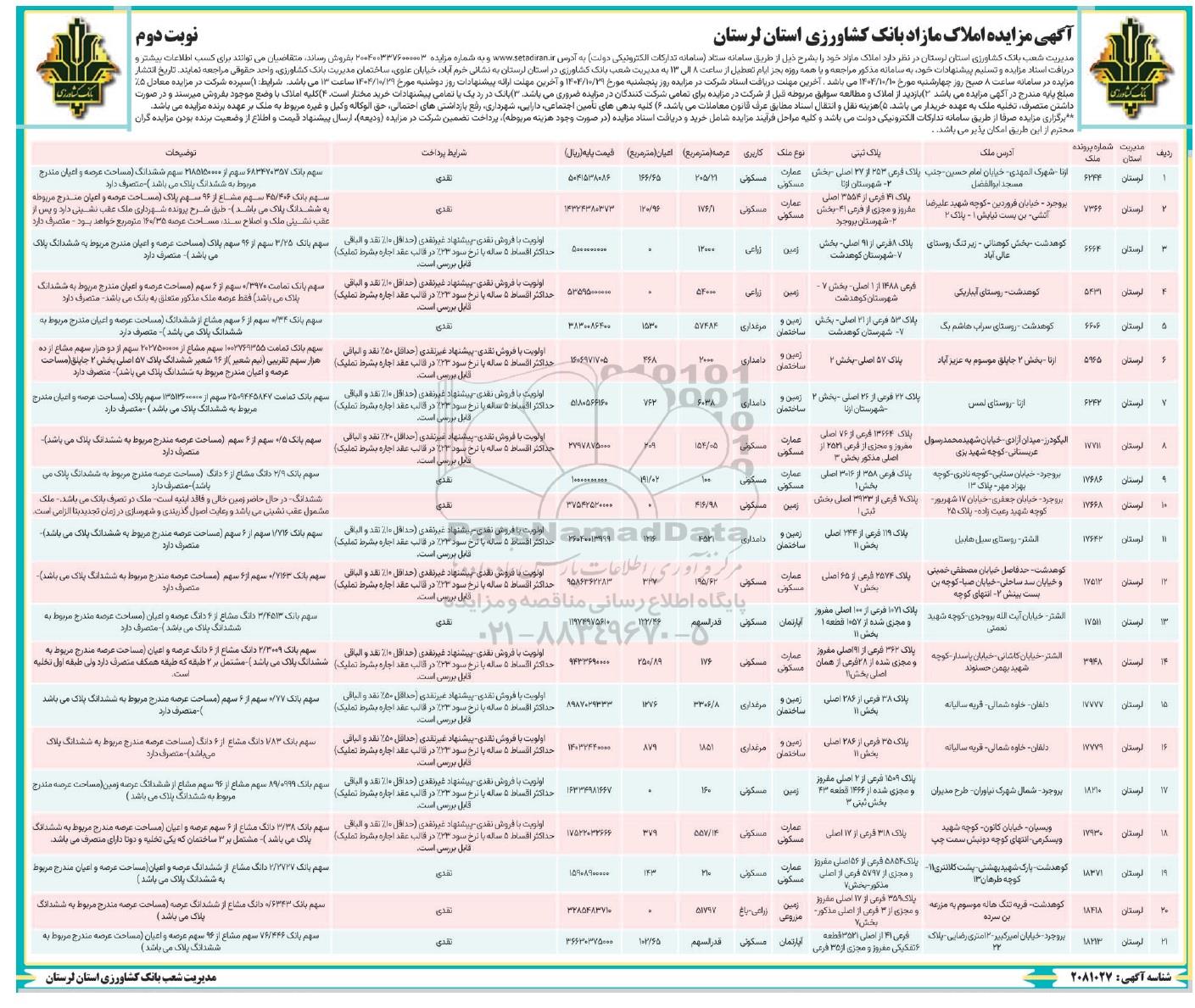 آگهی مزایده املاک مازاد بانک کشاورزی استان لرستان نوبت دوم