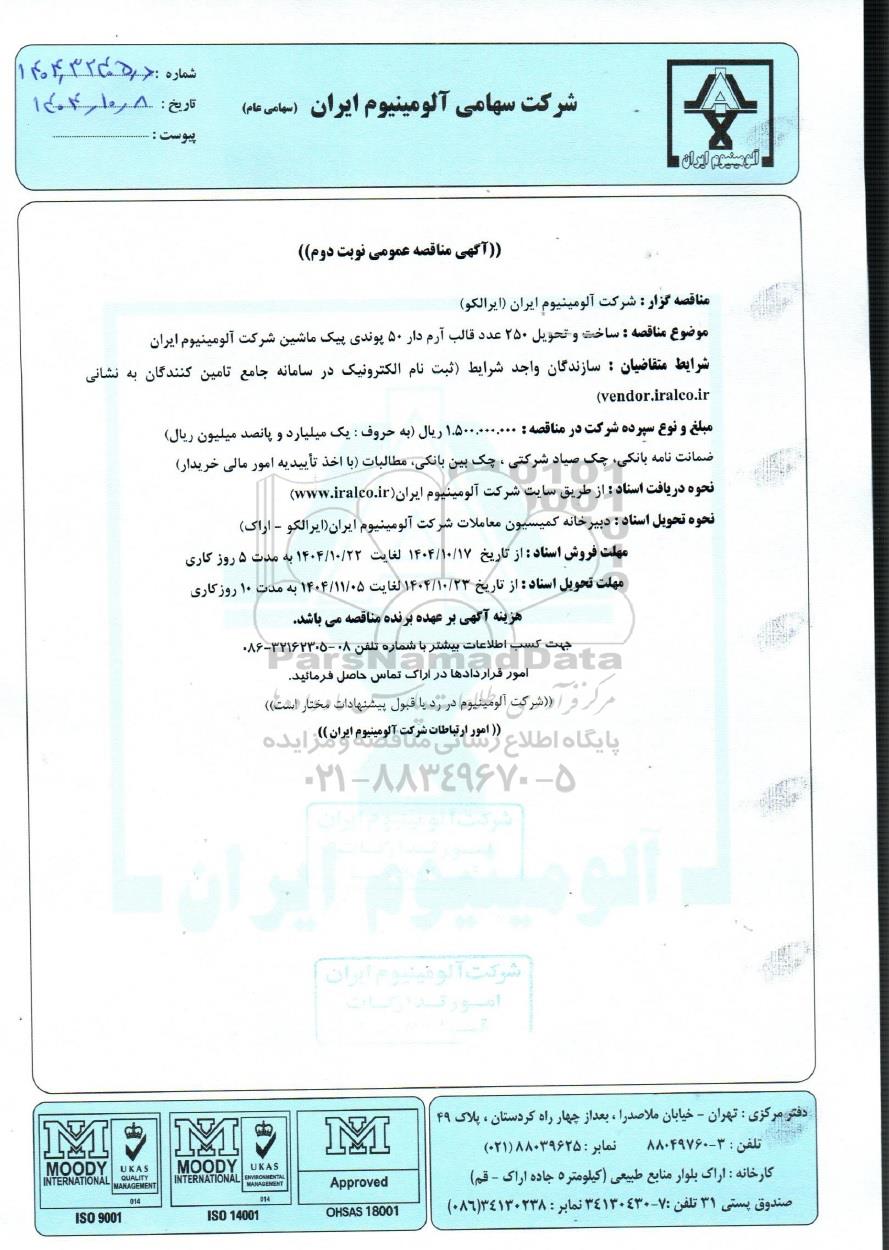 موضوع مناقصه : ساخت و تحویل 250 عدد قالب آرم دار 50 پوندی پیک ماشین شرکت آلومینیوم ایران
