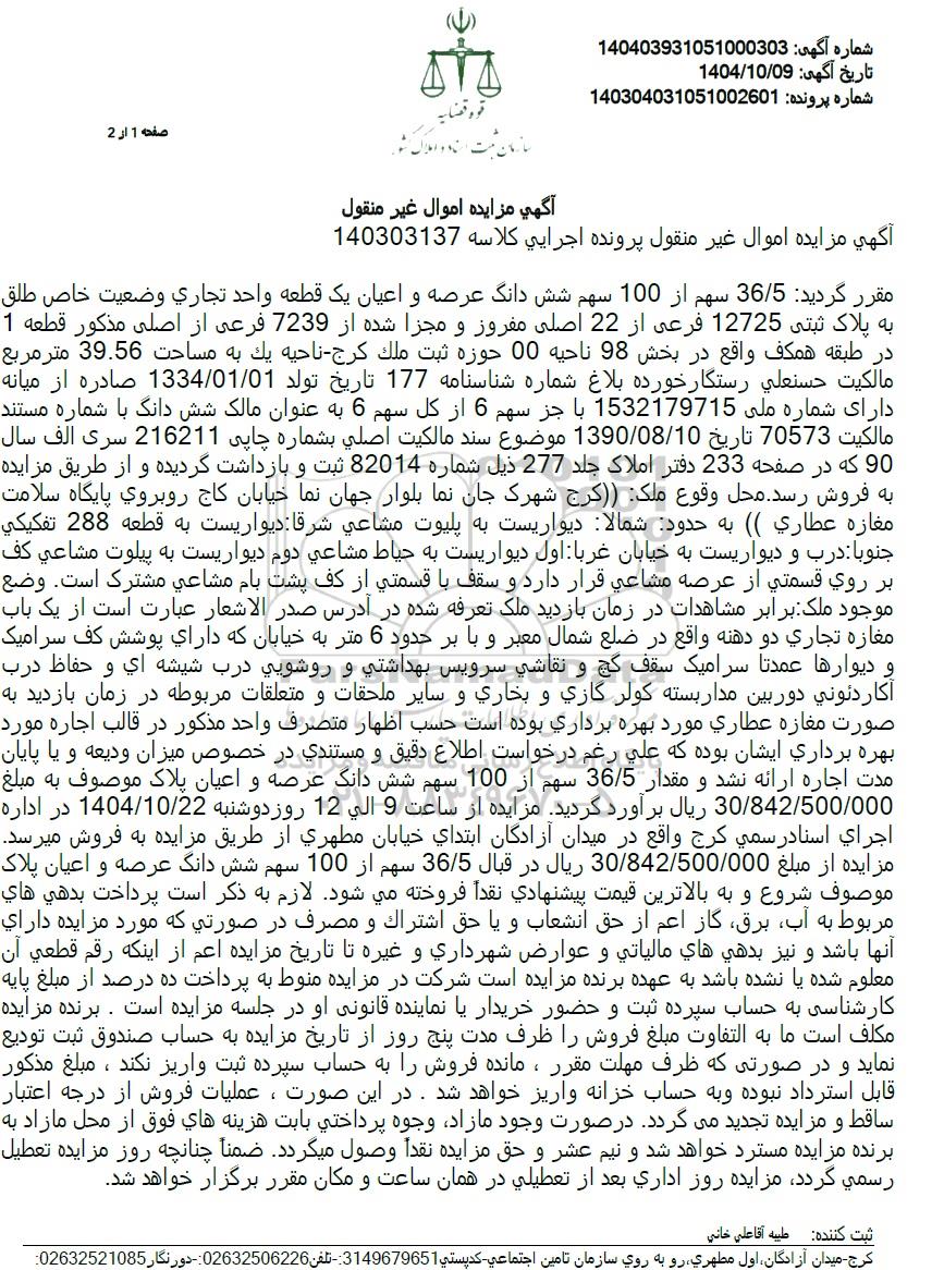 مقرر گردید 36/5 سهم از 100 سهم شش دانگ عرصه و اعیان یک قطعه واحد تجاری وضعیت خاص طلق به پلاک ثبتی 12725 فرعی از 22 اصلی مفروز و مجزا شده از 7239 فرعی از اصلی مذکور قطعه 1 در طبقه همکف واقع در بخش 98 ناحیه 00 حوزه ثبت ملك كرج - ناحیه یك به مساحت 39.56 متر مربع مالکیت حسنعلی رستگار خورده بلاغ شماره شناسنامه 177 تاریخ تولد 1334/01/01 صادره از میانه دارای شماره ملی 1532179715 با جز سهم 6 از کل سهم 6 به عنوان مالک شش دانگ با شماره مستند مالكیت 70573 تاریخ 1390/08/10 موضوع سند مالكیت اصلی بشماره چاپی 216211 سری الف سال 90 که در صفحه 233 دفتر املاک جلد 277 ذیل شماره 82014 ثبت و بازداشت گردیده و از طریق مزایده به فروش رسد. محل وقوع ملک (کرج) شهرک جان نما بلوار جهان نما خیابان کاج روبروی پایگاه سلامت مغازه عطاری (( به حدود شمالا دیواریست به پلیوت مشاعی شرقا دیواریست به قطعه 288 تفكیكی جنوبا درب و دیواریست به خیابان غربا اول دیواریست به حیاط مشاعی دوم دیواریست به پیلوت مشاعی کف بر روی قسمتی از عرصه مشاعی قرار دارد و سقف با قسمتی از کف پشت بام مشاعی مشترک است. وضع موجود ملک برابر مشاهدات در زمان بازدید ملک تعرفه شده در آدرس صدر الاشعار عبارت است از یک باب مغازه تجاری دو دهنه واقع در ضلع شمال معبر و با بر حدود 6 متر به خیابان که دارای پوشش کف سرامیک و دیوارها عمدتا سرامیک سقف گچ و نقاشی سرویس بهداشتی و روشویی درب شیشه ای و حفاظ درب آکاردئونی دوربین مدار بسته کولر گازی و بخاری و سایر ملحقات و متعلقات مربوطه در زمان بازدید به صورت مغازه عطاری مورد بهره برداری بوده است حسب اظهار متصرف واحد مذکور در قالب اجاره مورد بهره برداری ایشان بوده که علی رغم درخواست اطلاع دقیق و مستندی در خصوص میزان ودیعه و یا پایان مدت اجاره ارائه نشد و مقدار 36/5 سهم از 100 سهم شش دانگ عرصه و اعیان پلاک موصوف به مبلغ 30/842/500/000 ریال برآورد گردید. مزایده از ساعت 9 الی 12 روز دوشنبه 1404/10/22 در اداره اجرای اسنادرسمی كرج واقع در میدان آزادگان ابتدای خیابان مطهری از طریق مزایده به فروش میرسد. مزایده از مبلغ 30/842/500/000 ریال در قبال 36/5 سهم از 100 سهم شش دانگ عرصه و اعیان پلاک موصوف شروع و به بالاترین قیمت پیشنهادی نقداً فروخته می شود. لازم به ذکر است پرداخت بدهی های مربوط به آب برق گاز اعم از حق انشعاب و یا حق اشتراك و مصرف در صورتی که مورد مزایده دارای آنها باشد و نیز بدهی های مالیاتی و عوارض شهرداری و غیره تا تاریخ مزایده اعم از اینکه رقم قطعی آن معلوم شده یا نشده باشد به عهده برنده مزایده است شرکت در مزایده منوط به پرداخت ده درصد از مبلغ پایه کارشناسی به حساب سپرده ثبت و حضور خریدار یا نماینده قانونی او در جلسه مزایده است. برنده مزایده مكلف است ما به التفاوت مبلغ فروش را ظرف مدت پنج روز از تاریخ مزایده به حساب صندوق ثبت تودیع نماید و در صورتی که ظرف مهلت مقرر ، مانده فروش را به حساب سپرده ثبت واریز نکند ، مبلغ مذکور قابل استرداد نبوده و به حساب خزانه واریز خواهد شد. در این صورت، عملیات فروش از درجه اعتبار ساقط و مزایده تجدید میگردد در صورت وجود مازاد وجوه پرداختی بابت هزینه های فوق از محل مازاد به برنده مزایده مسترد خواهد شد و نیم عشر و حق مزایده نقداً وصول میگردد. ضمناً چنانچه روز مزایده تعطیل رسمی گردد مزایده روز اداری بعد از تعطیلی در همان ساعت و مکان مقرر برگزار خواهد شد.