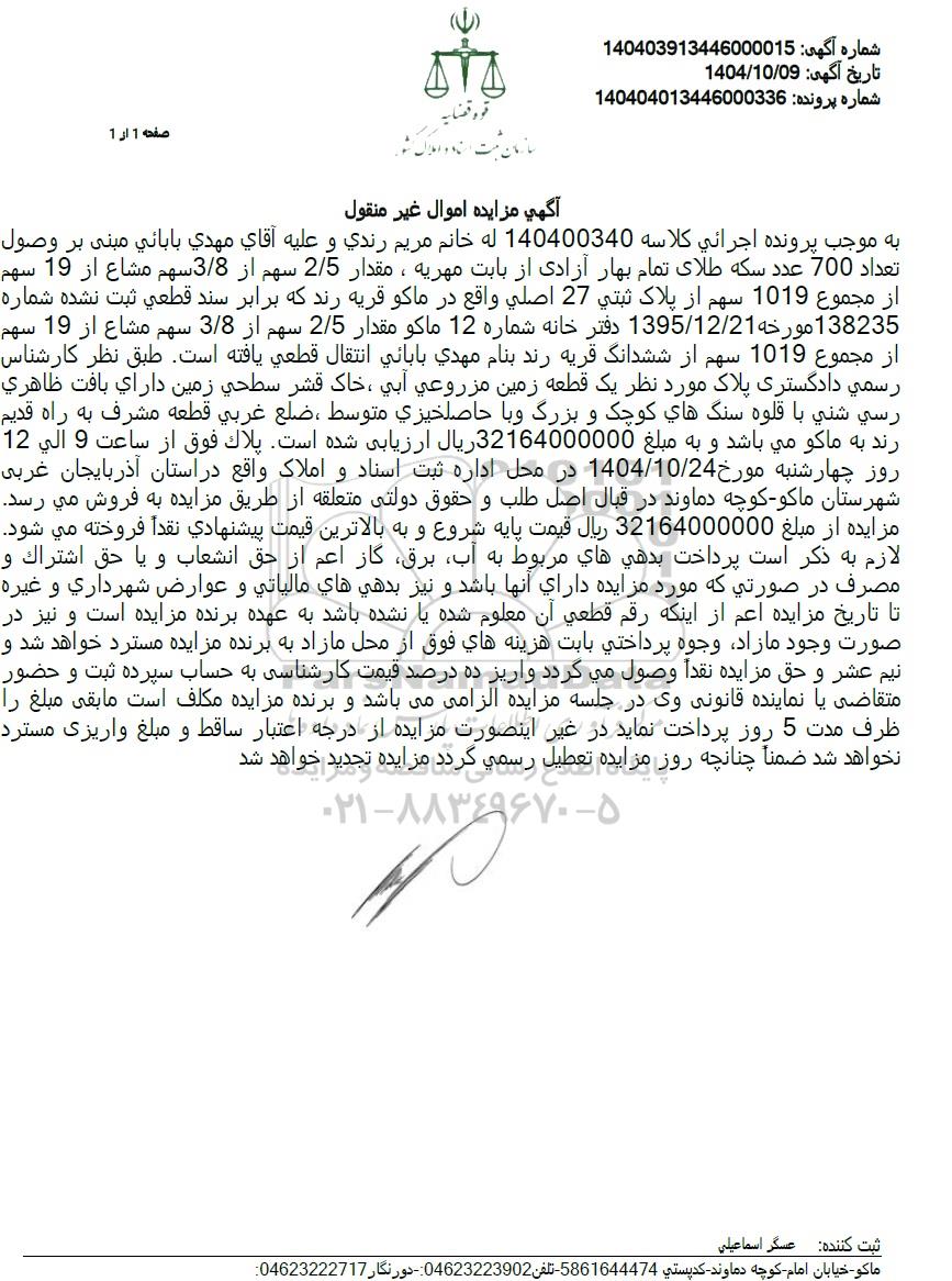 به موجب پرونده اجرائی کلاسه 140400340 له خانم مریم رندی و علیه آقای مهدی بابائی مبنی بر وصول تعداد 700 عدد سکه طلای تمام بهار آزادی از بابت مهریه ، مقدار 2/5 سهم از 3/8 سهم مشاع از 19 سهم از مجموع 1019 سهم از پلاك ثبتی 27 اصلی واقع در ماکو قریه رند که برابر سند قطعی ثبت نشده شماره 138235 مورخه 1395/12/21 دفتر خانه شماره 12 ماکو مقدار 2/5 سهم از 3/8 سهم مشاع از 19 سهم از مجموع 1019 سهم از ششدانگ قریه رند بنام مهدی بابائی انتقال قطعی یافته است. طبق نظر کارشناس رسمی دادگستری پلاک مورد نظر یک قطعه زمین مزروعی آبی ، خاک، قشر سطحی زمین دارای بافت ظاهری رسی شنی با قلوه سنگ های کوچک و بزرگ و با حاصلخیزی متوسط ، ضلع غربی قطعه مشرف به راه قدیم رند به ماکو می باشد و به مبلغ 32164000000 ریال ارزیابی شده است. پلاک فوق از ساعت 9 الی 12 روز چهارشنبه مورخ 1404/10/24 در محل اداره ثبت اسناد و املاک واقع در استان آذربایجان غربی شهرستان ماکو - کوچه دماوند در قبال اصل طلب و حقوق دولتی متعلقه از طریق مزایده به فروش می رسد. مزایده از مبلغ 32164000000 ریال قیمت پایه شروع و به بالاترین قیمت پیشنهادی نقداً فروخته می شود. لازم به ذکر است پرداخت بدهی های مربوط به آب برق گاز اعم از حق انشعاب و یا حق اشتراك و مصرف در صورتی که مورد مزایده دارای آنها باشد و نیز بدهی های مالیاتی و عوارض شهرداری و غیره تا تاریخ مزایده اعم از اینکه رقم قطعی آن معلوم شده یا نشده باشد به عهده برنده مزایده است و نیز در صورت وجود مازاد وجوه پرداختی بابت هزینه های فوق از محل مازاد به برنده مزایده مسترد خواهد شد و نیم عشر و حق مزایده نقداً وصول میگردد واریز ده درصد قیمت کارشناسی به حساب سپرده ثبت و حضور متقاضی یا نماینده قانونی وی در جلسه مزایده الزامی میباشد و برنده مزایده مکلف است مابقی مبلغ را ظرف مدت 5 روز پرداخت نماید در غیر اینصورت مزایده از درجه اعتبار ساقط و مبلغ واریزی مسترد نخواهد شد ضمناً چنانچه روز مزایده تعطیل رسمی گردد مزایده تجدید خواهد شد