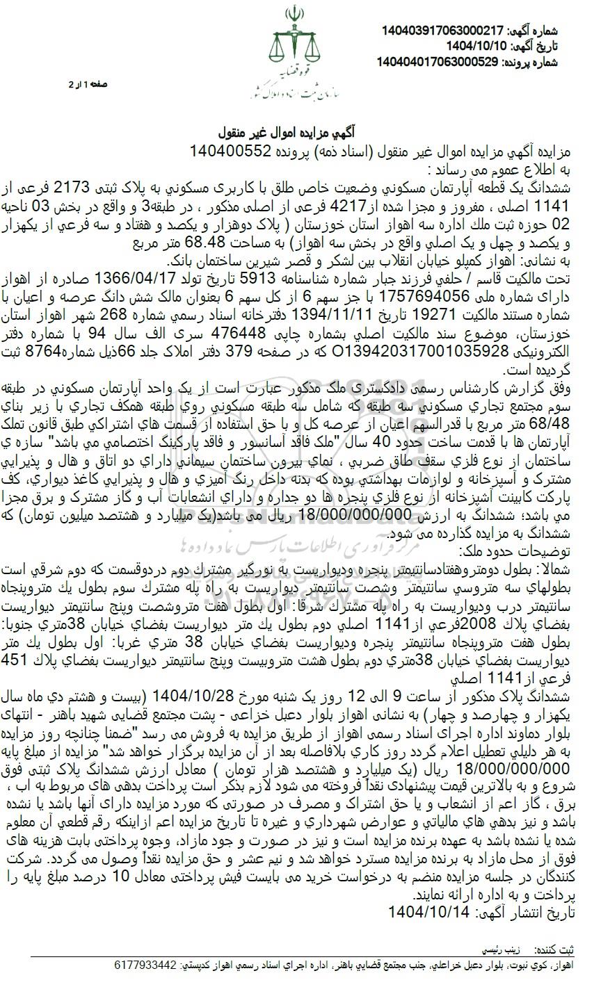 ششدانگ یک قطعه آپارتمان مسکونی وضعیت خاص طلق با کاربری مسکونی به پلاک ثبتی 2173 فرعی از 1141 اصلی ، مفروز و مجزا شده از 4217 فرعی از اصلی مذکور، در طبقه 3 و واقع در بخش 03 ناحیه 02 حوزه ثبت ملک اداره سه اهواز استان خوزستان  پلاک دو هزار و یکصد و هفتاد و سه فرعی از یکهزار و یکصد و چهل و یک اصلی واقع در بخش سه اهواز به مساحت 68.48 متر مربع به نشانی اهواز کمپلو خیابان انقلاب بین لشکر و قصر شیرین ساختمان بانک