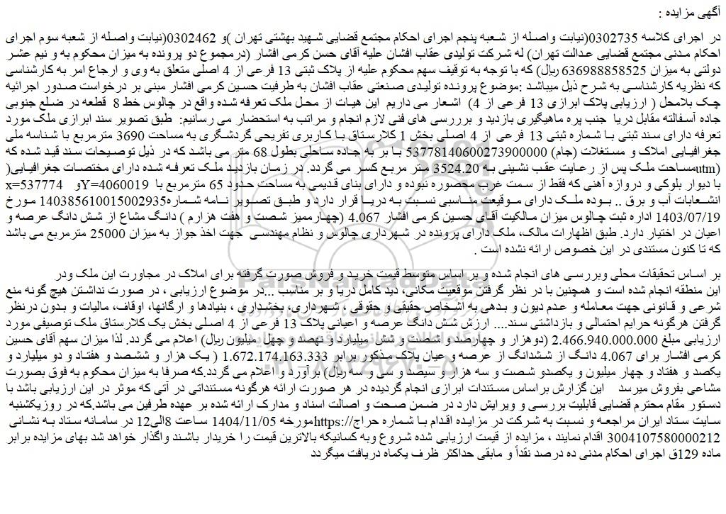 در اجرای کلاسه 0302735(نیابت واصله از شعبه پنجم اجرای احکام مجتمع قضایی شهید بهشتی تهران )و 0302462(نیابت واصله از شعبه سوم اجرای احکام مدنی مجتمع قضایی عدالت تهران) له شرکت تولیدی عقاب افشان علیه آقای حسن کرمی افشار (درمجموع دو پرونده به میزان محکوم به و نیم عشر دولتی به میزان 636988858525 ریال) که با توجه به توقیف سهم محکوم علیه از پلاک ثبتی 13 فرعی از 4 اصلی متعلق به وی و ارجاع امر به کارشناسی که نظریه کارشناسی به شرح ذیل میباشد :موضوع پرونده تولیدی صنعتی عقاب افشان به طرفیت حسین کرمی افشار مبنی بر درخواست صدور اجرائیه چک بلامحل ( ارزیابی پلاک ابرازی 13 فرعی از 4) اشعار می داریم این هیات از محل ملک تعرفه شده واقع در چالوس خط 8 قطعه در ضلع جنوبی جاده آسفالته مقابل دریا جنب پره ماهیگیری بازدید و برررسی های فنی لازم انجام و مراتب به استحضار می رسانیم: طبق تصویر سند ابرازی ملک مورد تعرفه دارای سند ثبتی با شماره ثبتی 13 فرعی از 4 اصلی بخش 1 کلارستاق با کاربری تفریحی گردشگری به مساحت 3690 مترمربع با شناسه ملی جغرافیایی املاک و مستغلات (جام) 53778140600273900000 با بر به جاده ساحلی بطول 68 متر می باشد که در ذیل توصیحات سند قید شده که مساحت ملک پس از رعایت عقب نشینی به 3524.20 متر مربع کسر می گردد. در زمان بازدید ملک تعرفه شده دارای مختصات جغرافیایی(utm) x=537774 و y=4060019 با دیوار بلوکی و دروازه آهنی که فقط از سمت غرب محصوره نبوده و دارای بنای قدیمی به مساحت حدود 65 مترمربع با انشعابات آب و برق .. بوده ملک دارای موقیعت مناسبی نسبت به دریا قرار دارد و طبق تصویر نامه شماره140385610015002935 مورخ 1403/07/19 اداره ثبت چالوس میزان مالکیت آقای حسین کرمی افشار 4.067 (چهارممیز شصت و هفت هزارم ) دانگ مشاع از شش دانگ عرصه و اعیان در اختیار دارد. طبق اظهارات مالک، ملک دارای پرونده در شهرداری چالوس و نظام مهندسی جهت اخذ جواز به میزان 25000 مترمربع می باشد که تا کنون مستندی در این خصوص ارائه نشده است .